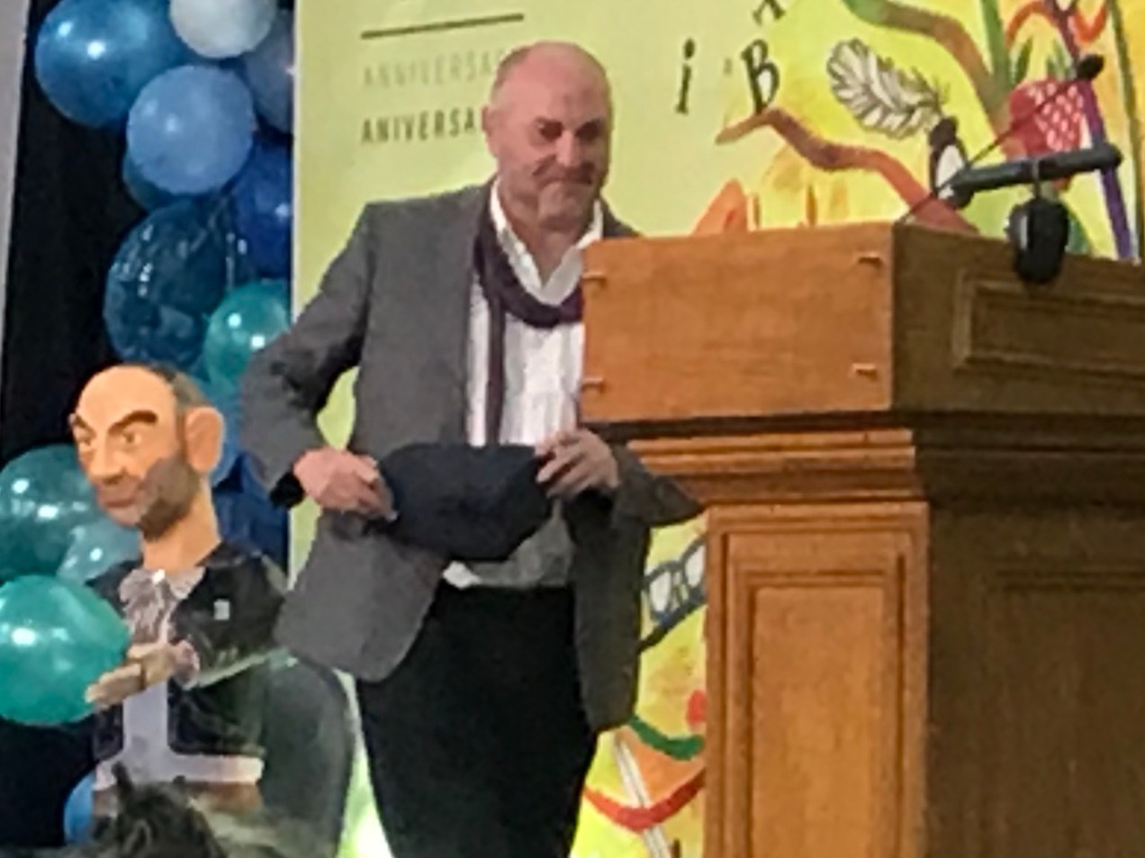 Share this: Click to share on X (Opens in new window) X Click to share on Facebook (Opens in new window) Facebook More Click to email a link to a friend (Opens in new window) Email Like Loading... Trackbacks are closed, but you can post a comment. IMG_0152 Colum McCann retrieves his hat from his papier mache likeness.