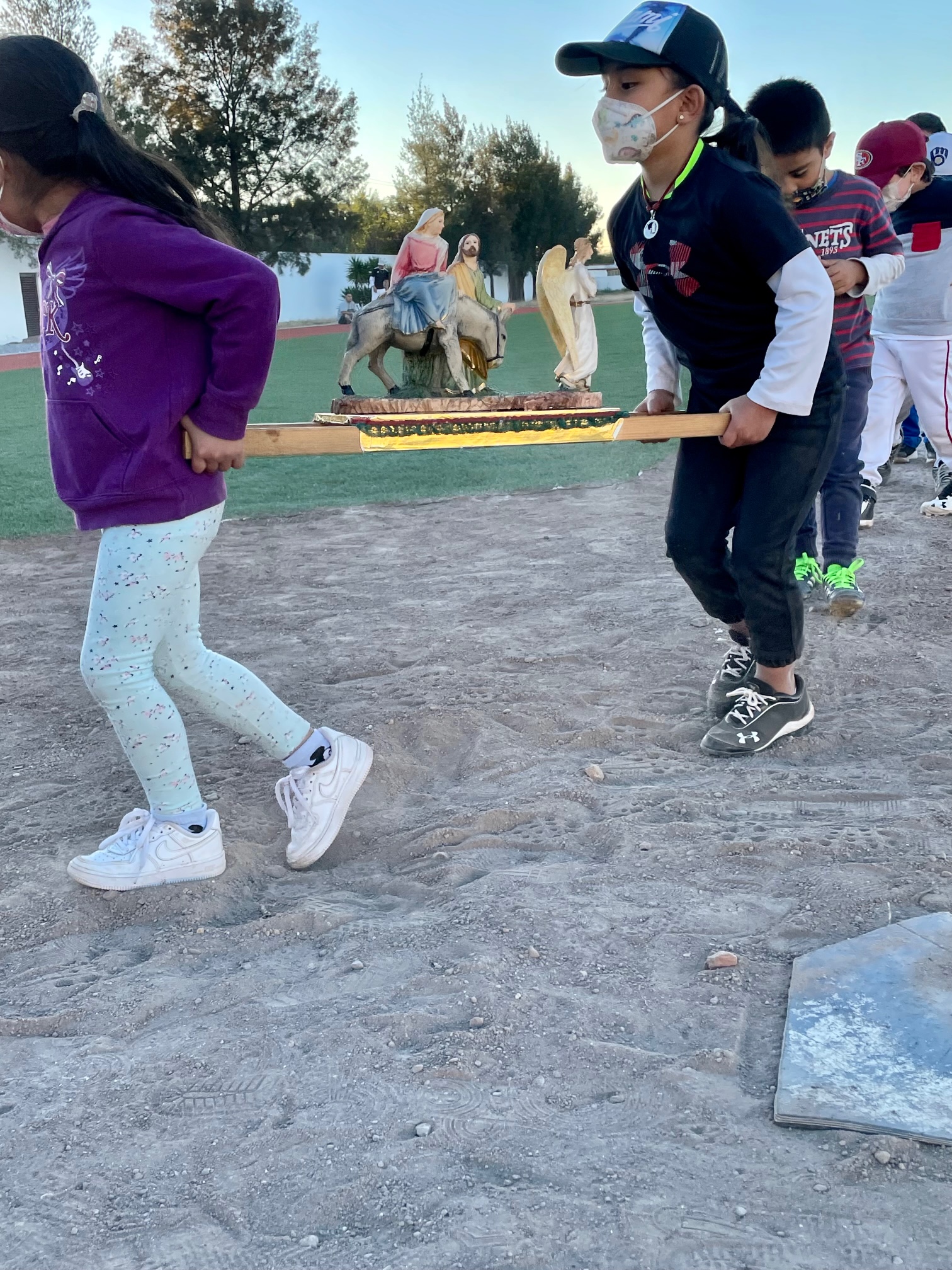 One minute a bunch of San Miguel youngsters are rounding the bases and heading for home in a lively baseball game against their parents. Moments later, they are rounding the same bases in single file, carrying a creche on a platform and singing the traditional songs of the Posada.