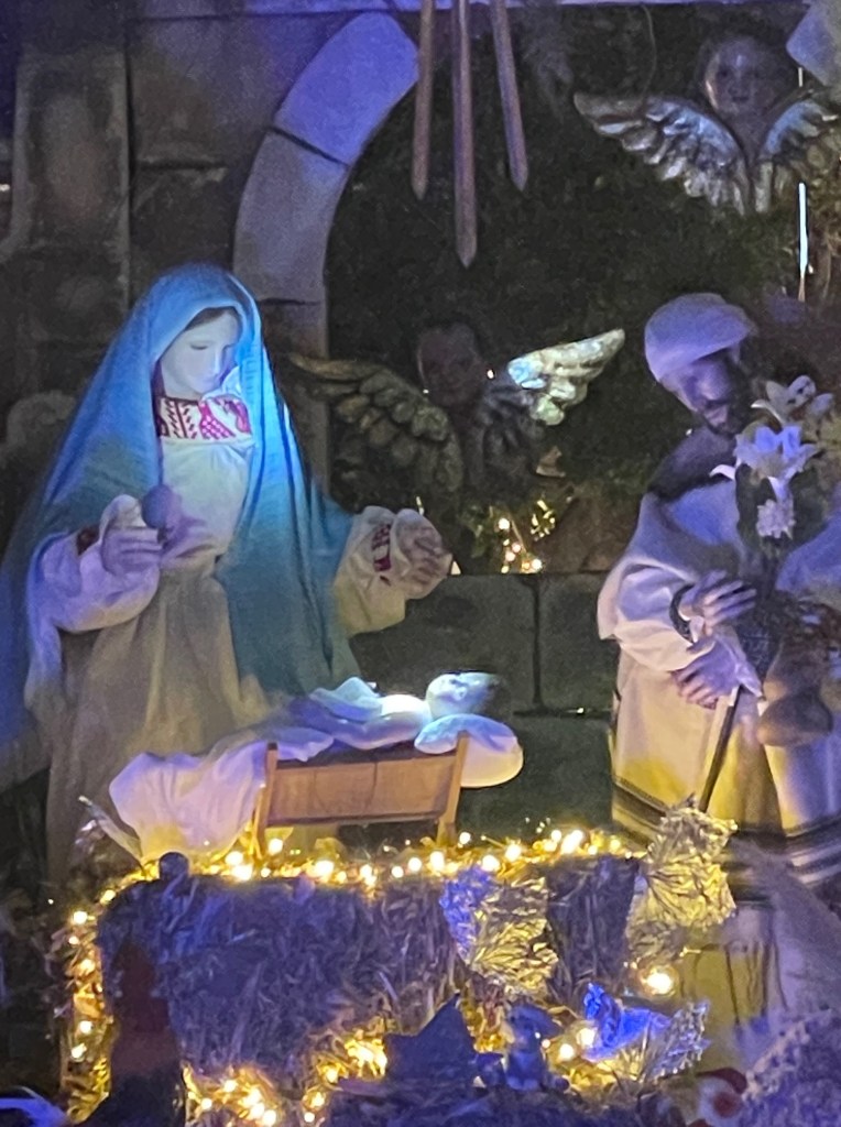 We’re taking our traditional stroll tonight, Christmas Eve, to witness the final Posada procession and take in the lights, the sounds, the people gathering about the community tree.