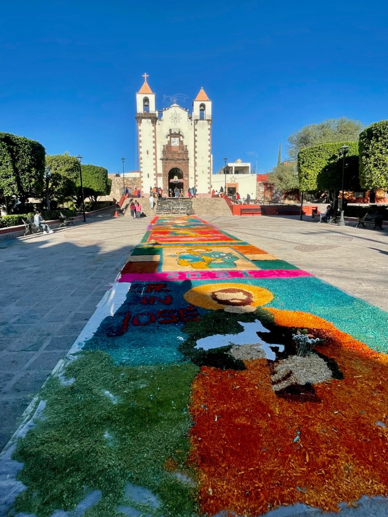 Templo De San Juan de Dios on San Antonio Abad, Zona Centro, San Miguel de Allende, prepares for Mass in the times of Covid and social distancing. Just before 9 a.m., as Moppit and I walked by, the church courtyard was filled with temporary outdoor seating. Not comfortable, but functional.Meanwhile, at Parroquia de San Antonio de Padua in Colonia San Antonio, a New Years Day tradition was resurrected on Saturday, the sawdust art pathway to the church. Seen here on Sunday morning, around 9:30 a.m.