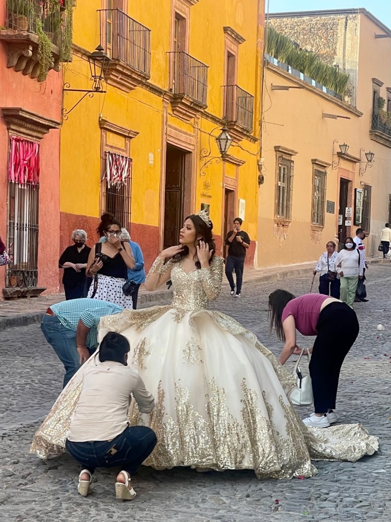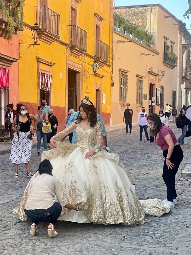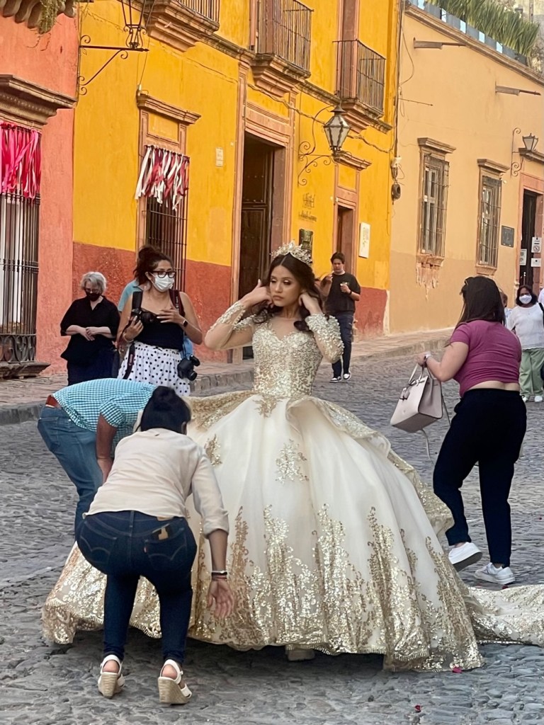 A late afternoon photoshoot in Centro. The retinue of loyal subjects ushers the princess down Cuna de Allende, beside the Parroquia de San Miguel Arcangel in San Miguel de Allende.