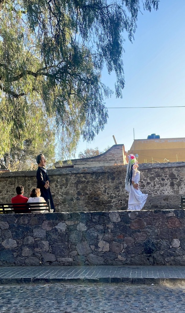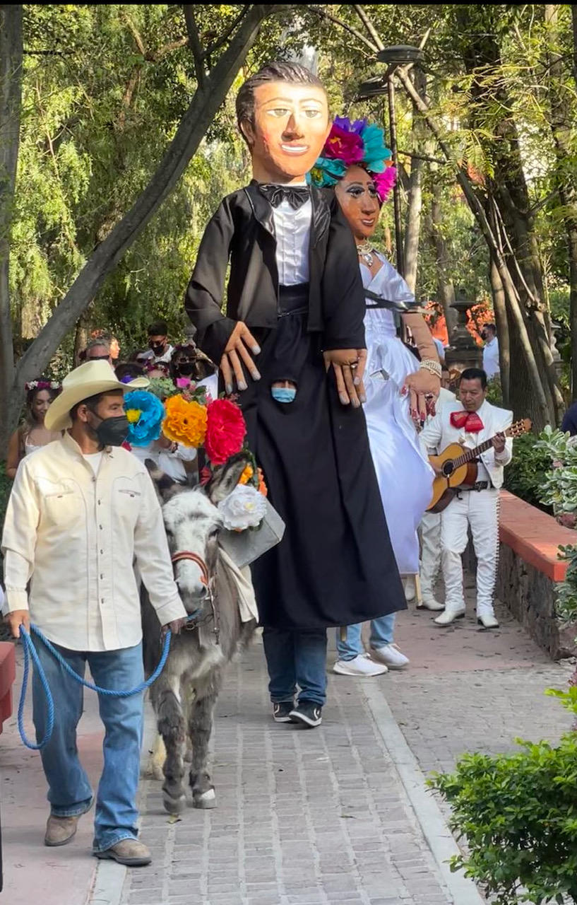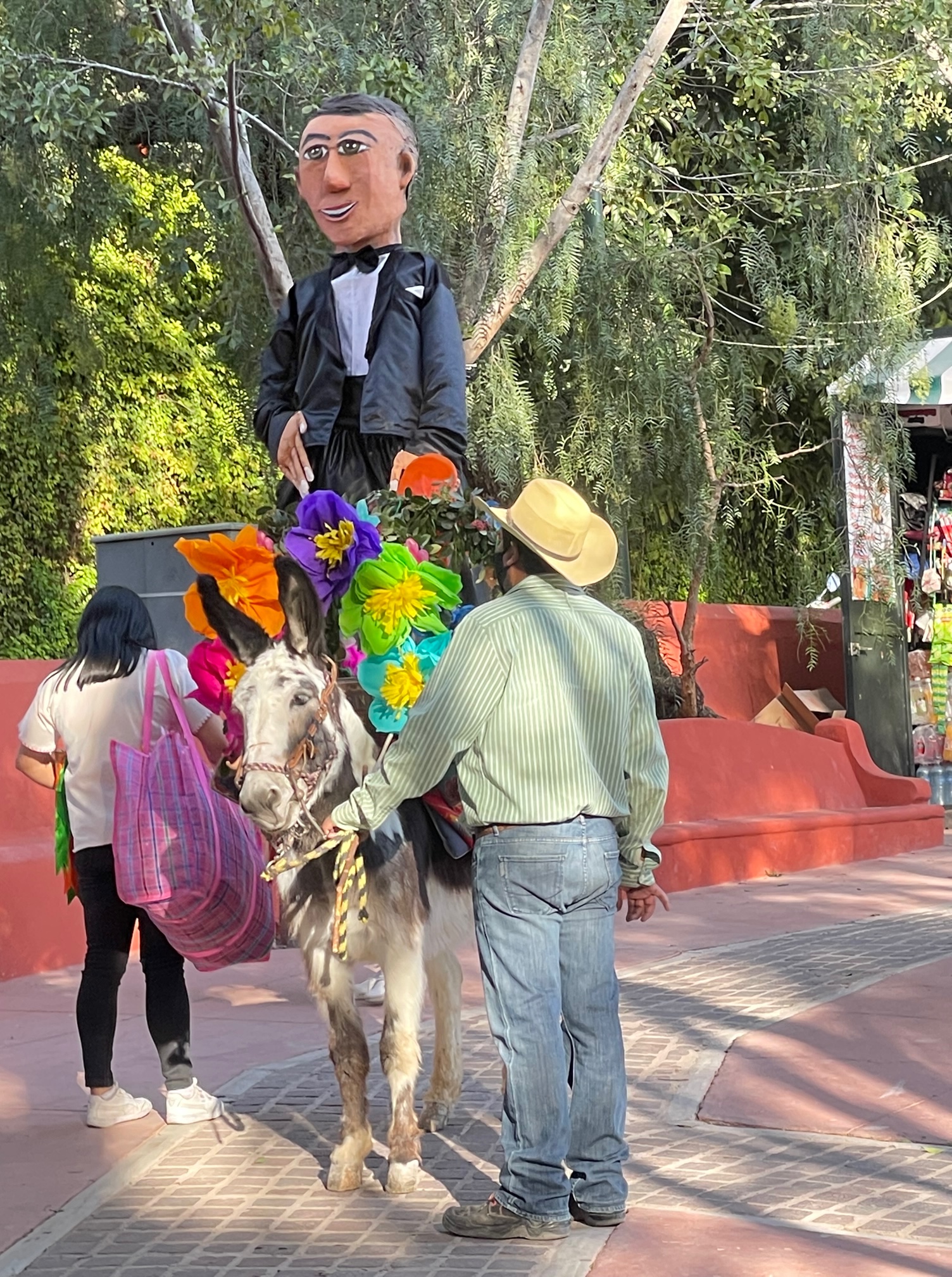 Early on a Friday evening, there can be several wedding parties each filling a far corner of Parque Juarez. Each is led by a pair of towering, spinning Mojiganghas — the wedding couple. Behind them is often a gaily decorate burro led by its sombreroed owner. In days past, the burro would carry a keg of tequila on its back and each guest would wear a porcelain cup on a lanyard around their necks, making refills quick and convenient.