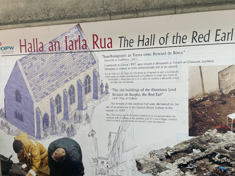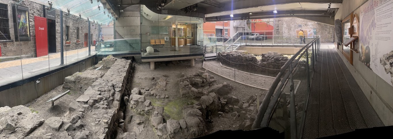 On Druid Lane, we pass a clear plexiglass wall where a storefront or two ought to be. On the other side is an archeological excavation. Above it, an officious-looking building rises several stories. The excavation, we find, is The Hall of the Red Earl. The 13th-century ruins are the earliest known within the medieval walls of the original city. They were discovered in 1997 during a Customs House expansion.