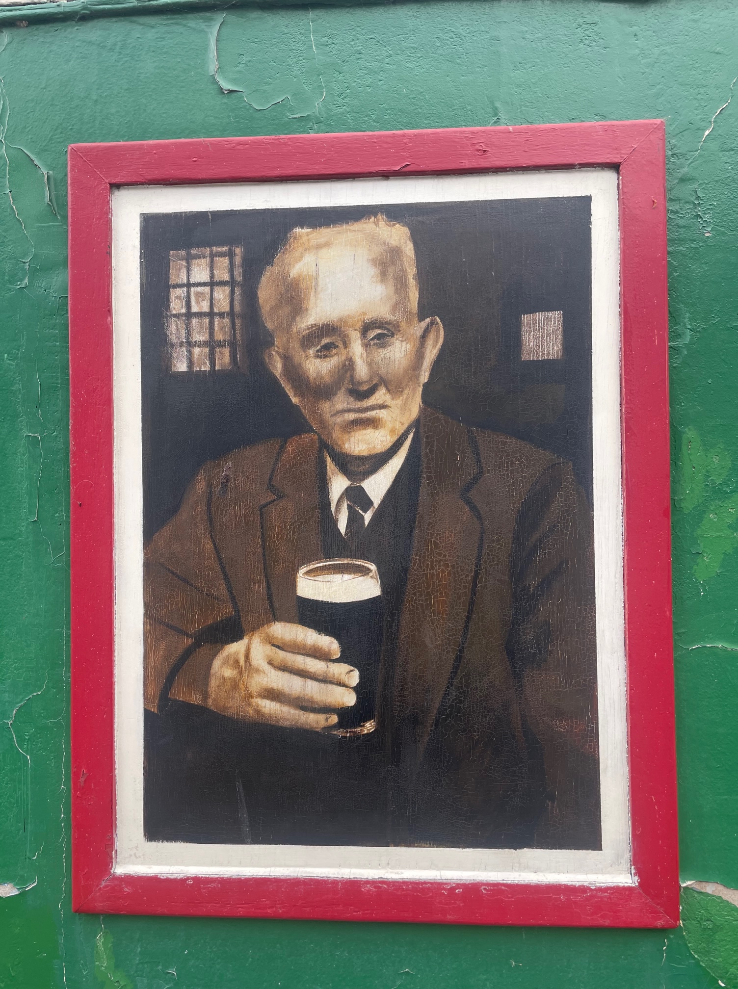 Across the street, above the Ember Firehouse, four prominent Irish writers peer from painted windows by Ciaran Dunlevy. We sip and try to suss out who they might be. Pádraic Ó Conaire, of course, lower right. And, naturally, James Joyce to the left. Upper right, surely William Butler Yeats. The gaunt and haunted fellow at left? Samuel Beckett, I’ll wager.
