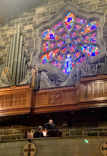 An organist and student are performing on the Trevor Crowe-built 59-stop organ in the gallery. The force of the sound from these pipes is stirring, uplifting, and exalting in the near-empty cavern.