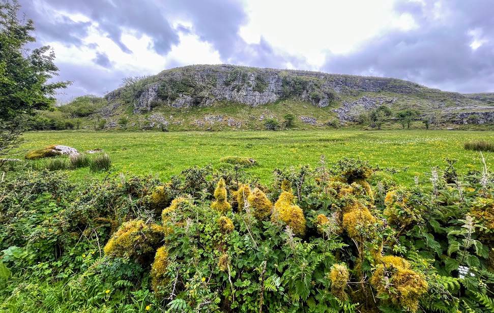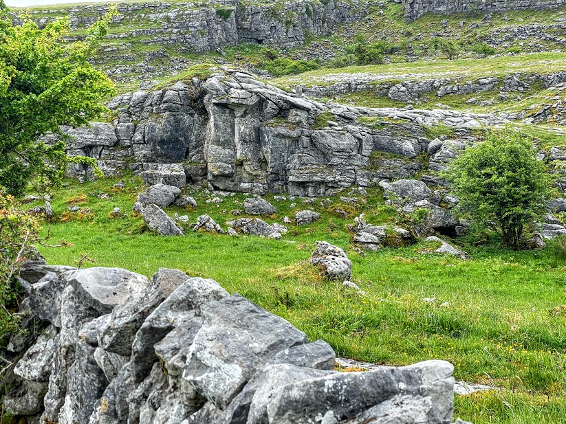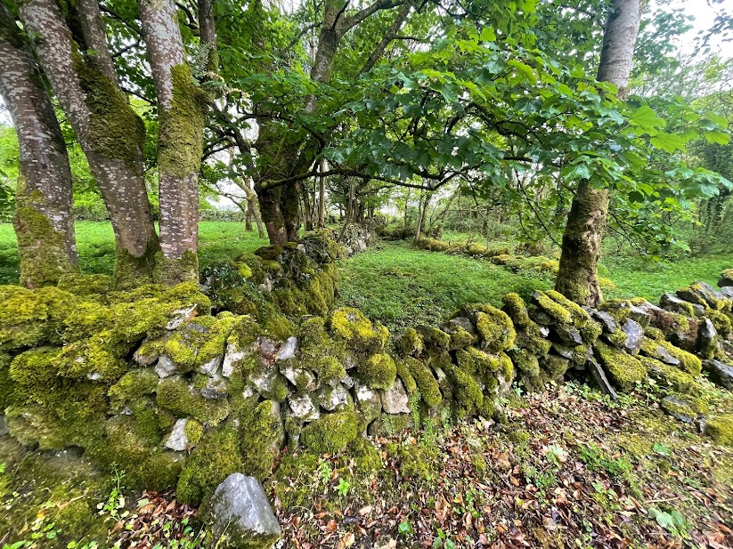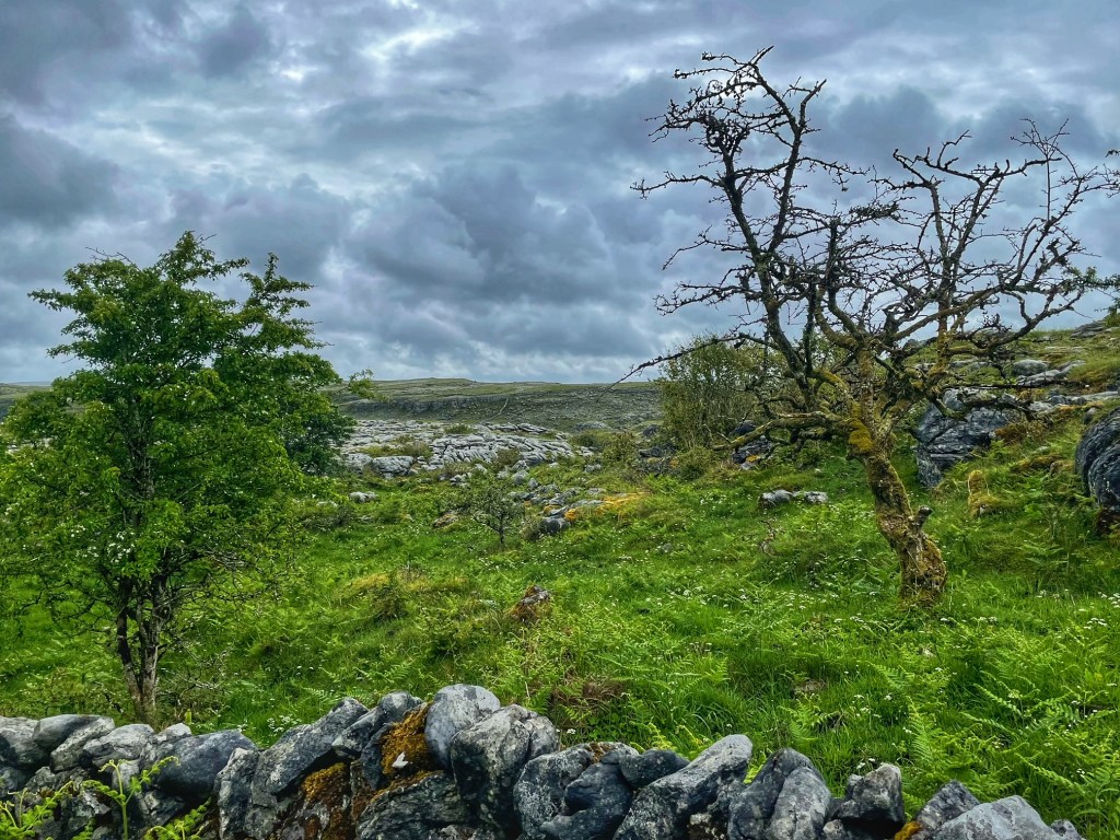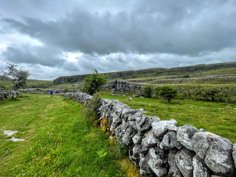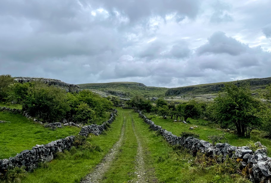 Some of the most stunning sights in five days of stunners. This trail rises gently through fields and forest, and at a crest in the hill, opens up to what we call an arroyo back in Mexico. Only this one looks like the Garden of Eden. There is Burren karst and monumental stones leaning upon one another, a steep rocky ridge, meadow grass and flowers, and twisted trees here and there.