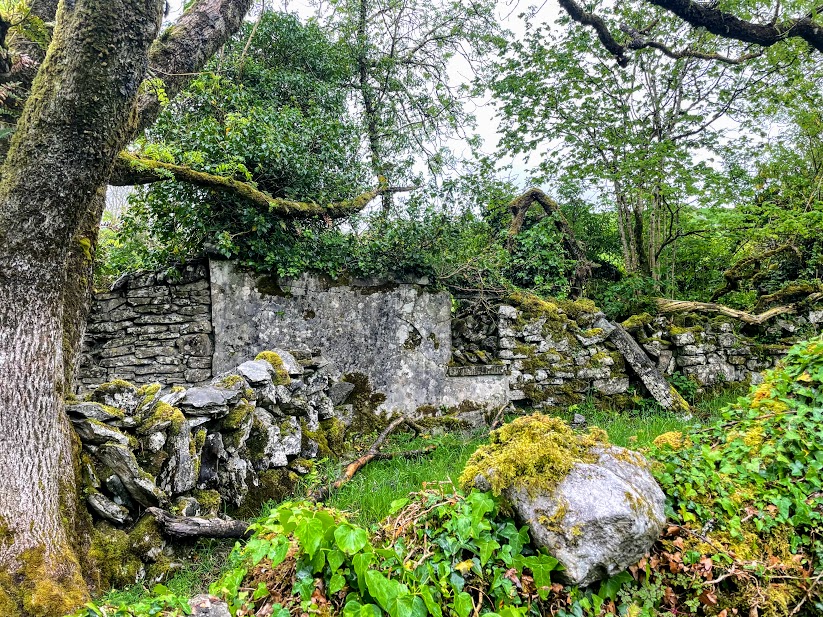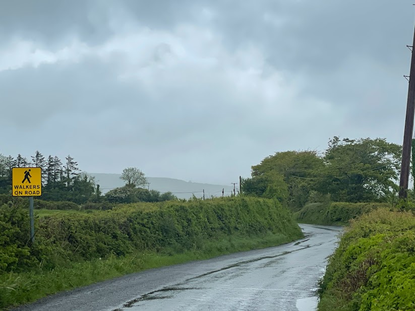 Day 5 begins in Carran, a wet start but a beautiful country road, with a right turn at the castle ruins: