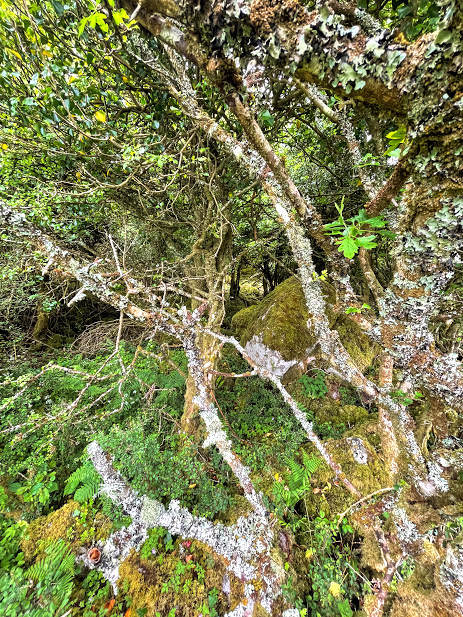 Rising out of this small valley we walk through ancient woodland. Peering into the darkened woods, I imagine curious trails of moss and heather between lichen-encrusted trees and rock piles that may have been small castles and lodges … if you squint very hard.