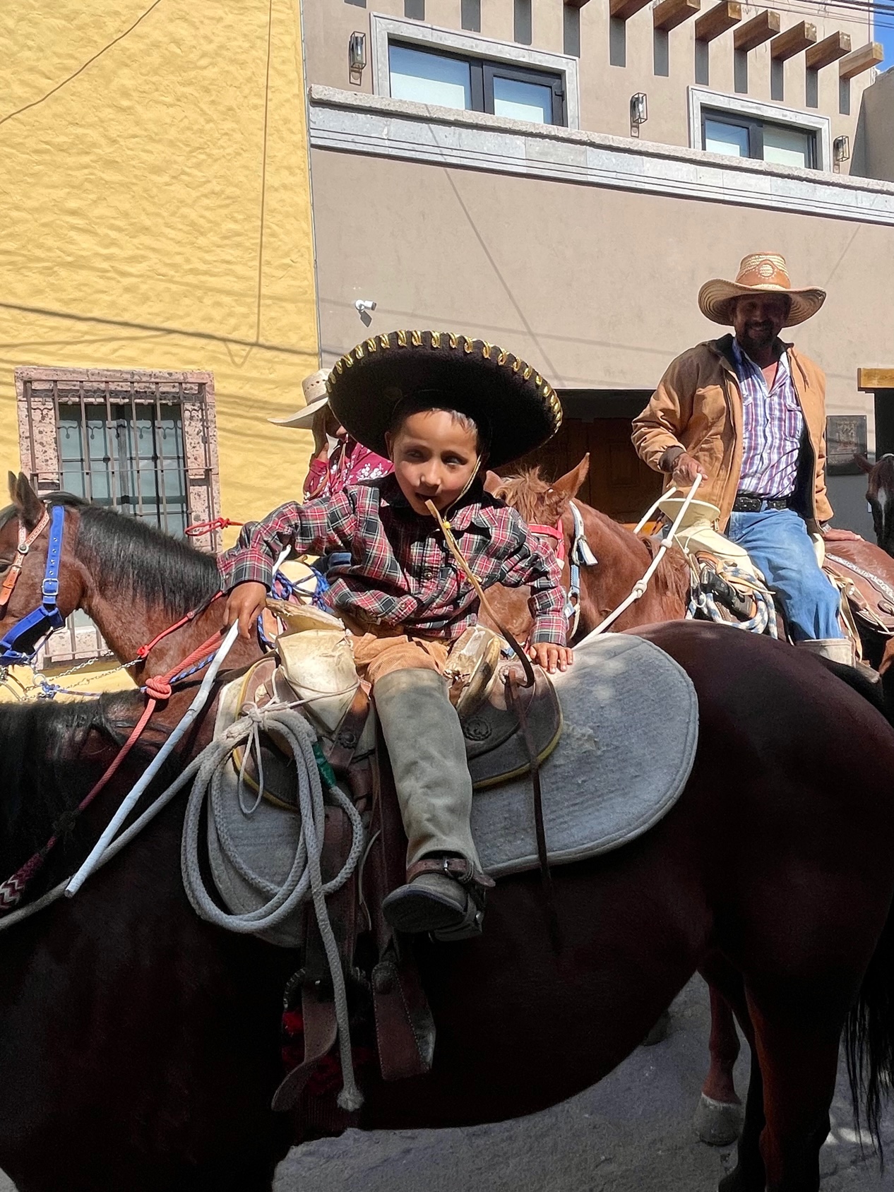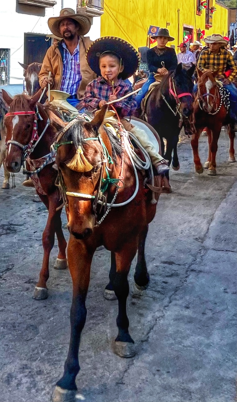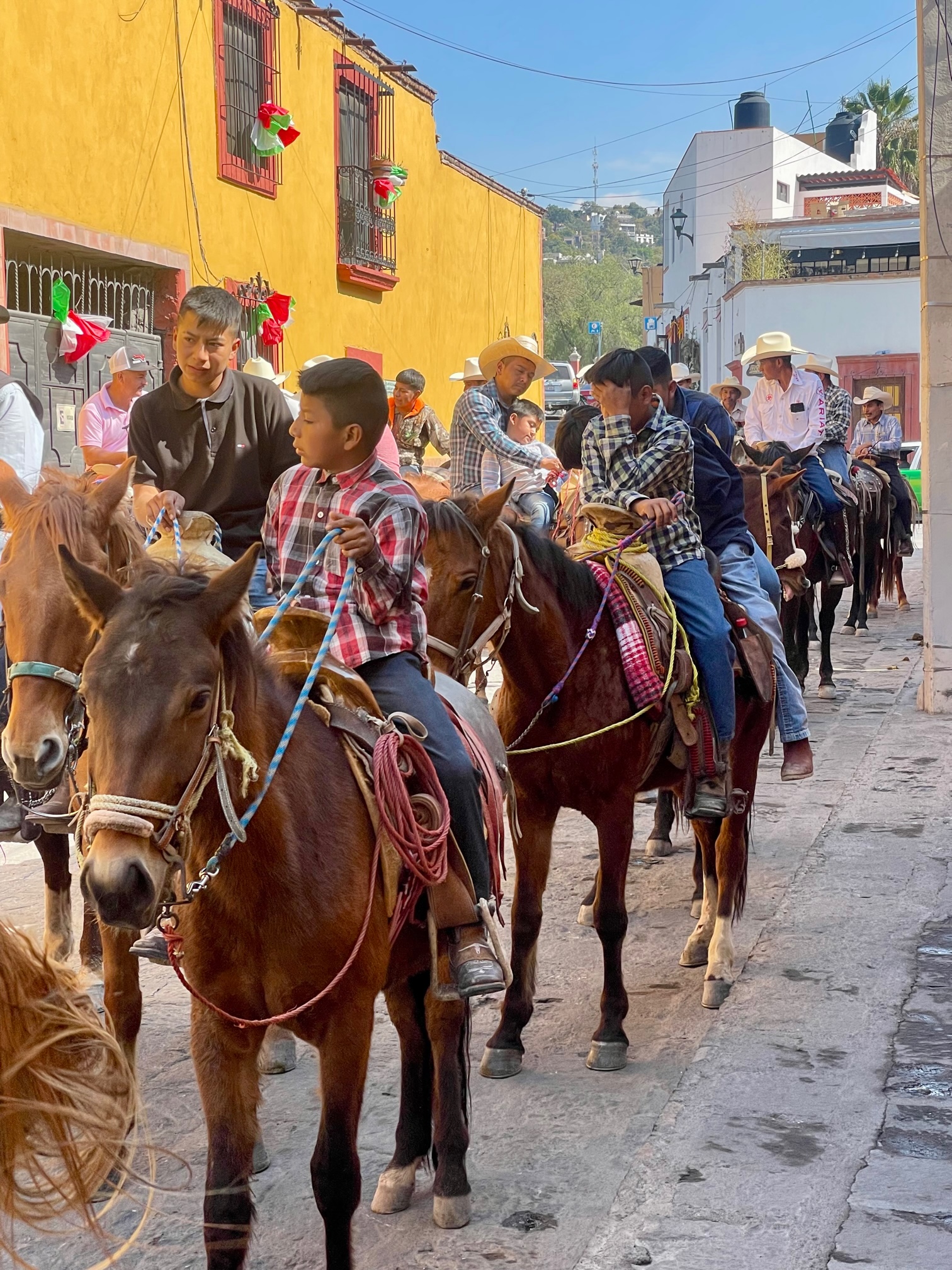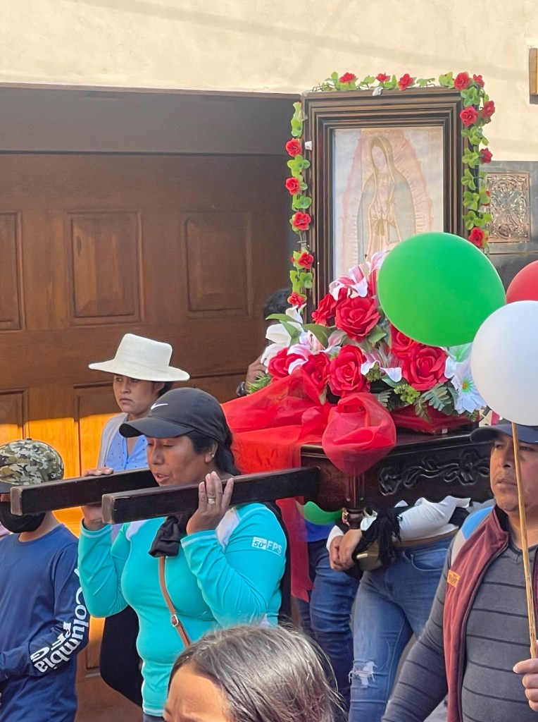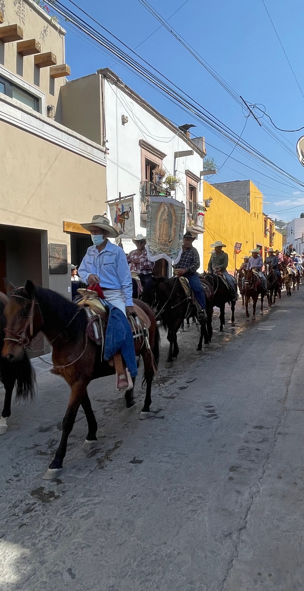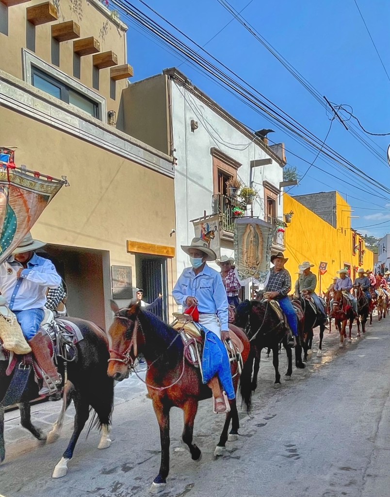 Today, it was the arrival of the procession honoring Our Lady of Guadalupe. The cavalcade of the holy and horses turned onto Callejon San Antonio at noon sharp and proceeded to walk in stops and starts toward the Parroquia de San Antonio de Padua.