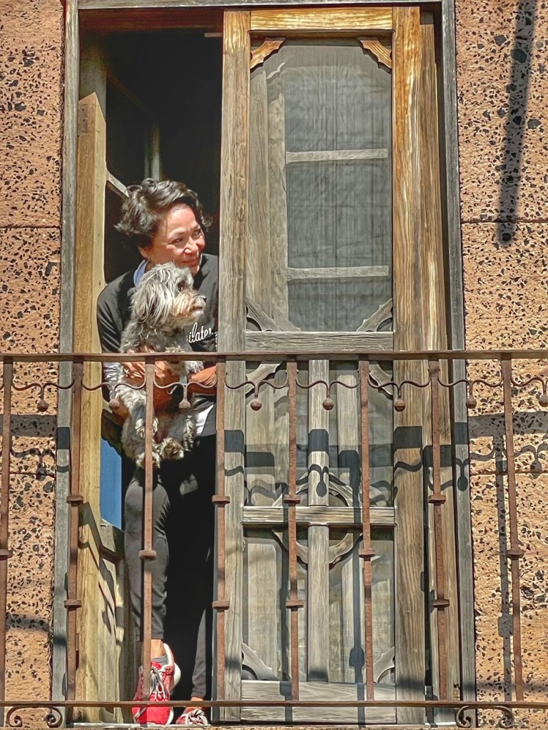 That is all I can tell you. my friend. I went back to look at the photo and there was only an open door on the second-floor balcony. No woman.No dog.