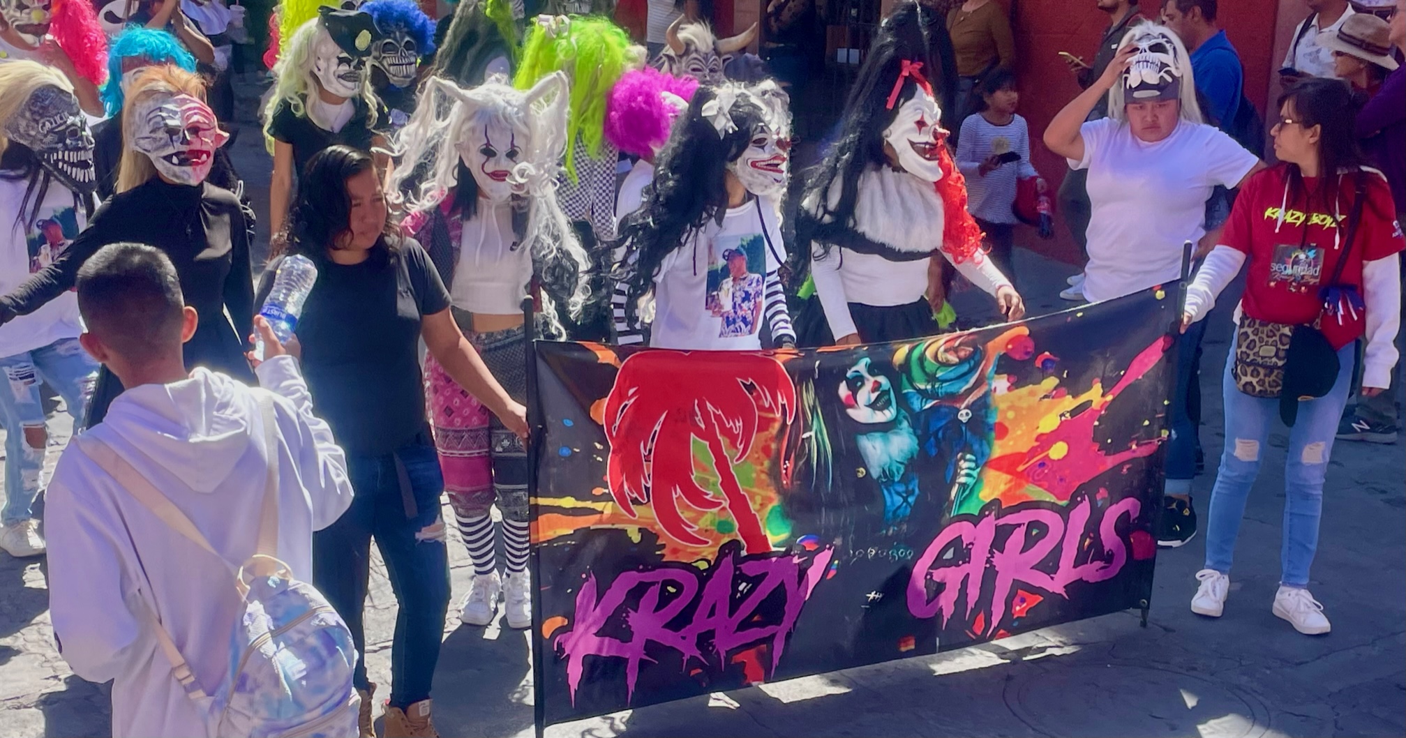 Up ahead of all the wildly costumed dancers is a more somber scene — the black hearse, mourners dressed in white shirts and blouses, somber and agonized looks on their faces. They walk at a painfully slow pace down Calle Insurgentes. The pace only enhances the sadness of the moment. In the front row, one mourner carries a picture of an all-too-young man. Beside him, another carries a stone urn with smokey incense.