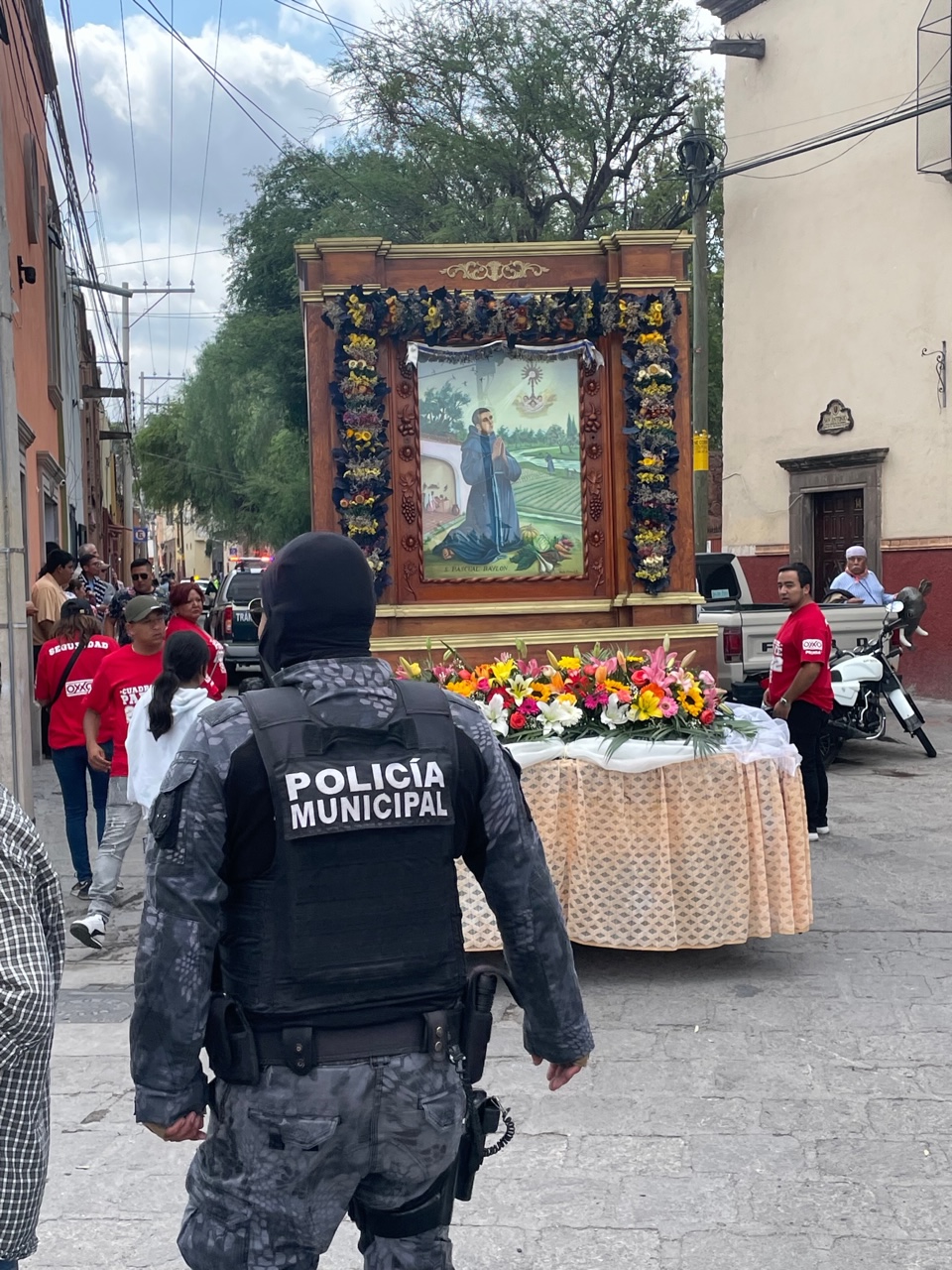 Today’s parades celebrate San Pascual Baylon, a devout friar known for humility, hospitality, and stout devotion to the Eucharist. Many more devotees than paraders were waiting in line this morning to enter the San Antonio church to venerate before the golden monstrance set up at the entrance.