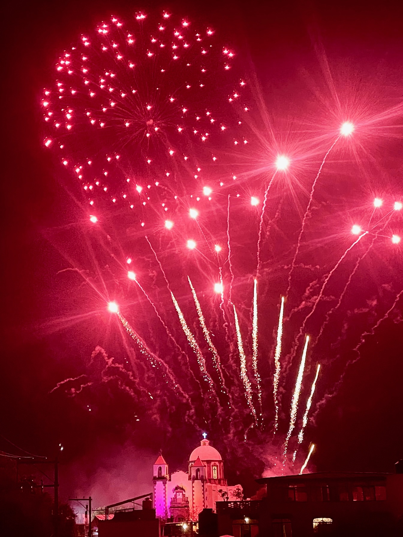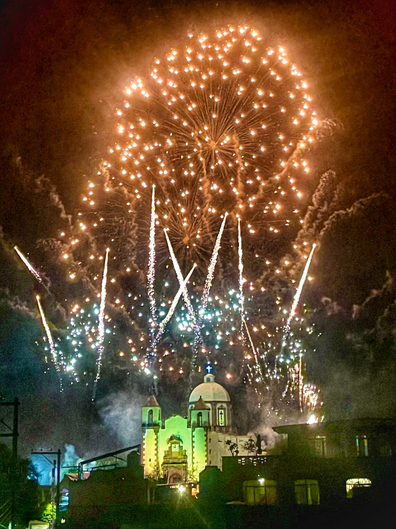 After two weeks of festivities ramping up to the Feast of Saint Anthony and the Convite de Locos on Sunday, the closing night fireworks were spectacular. Flashes, flames, arcs of brilliant light, cascades of incandescence, strobes of white heat, yellow flamethrowers, whistles, and booms all danced around the Parroquia San Antonio de Padua in Colonia San Antonio.