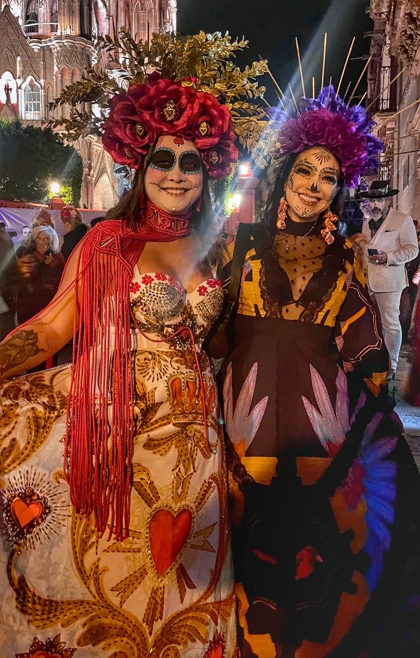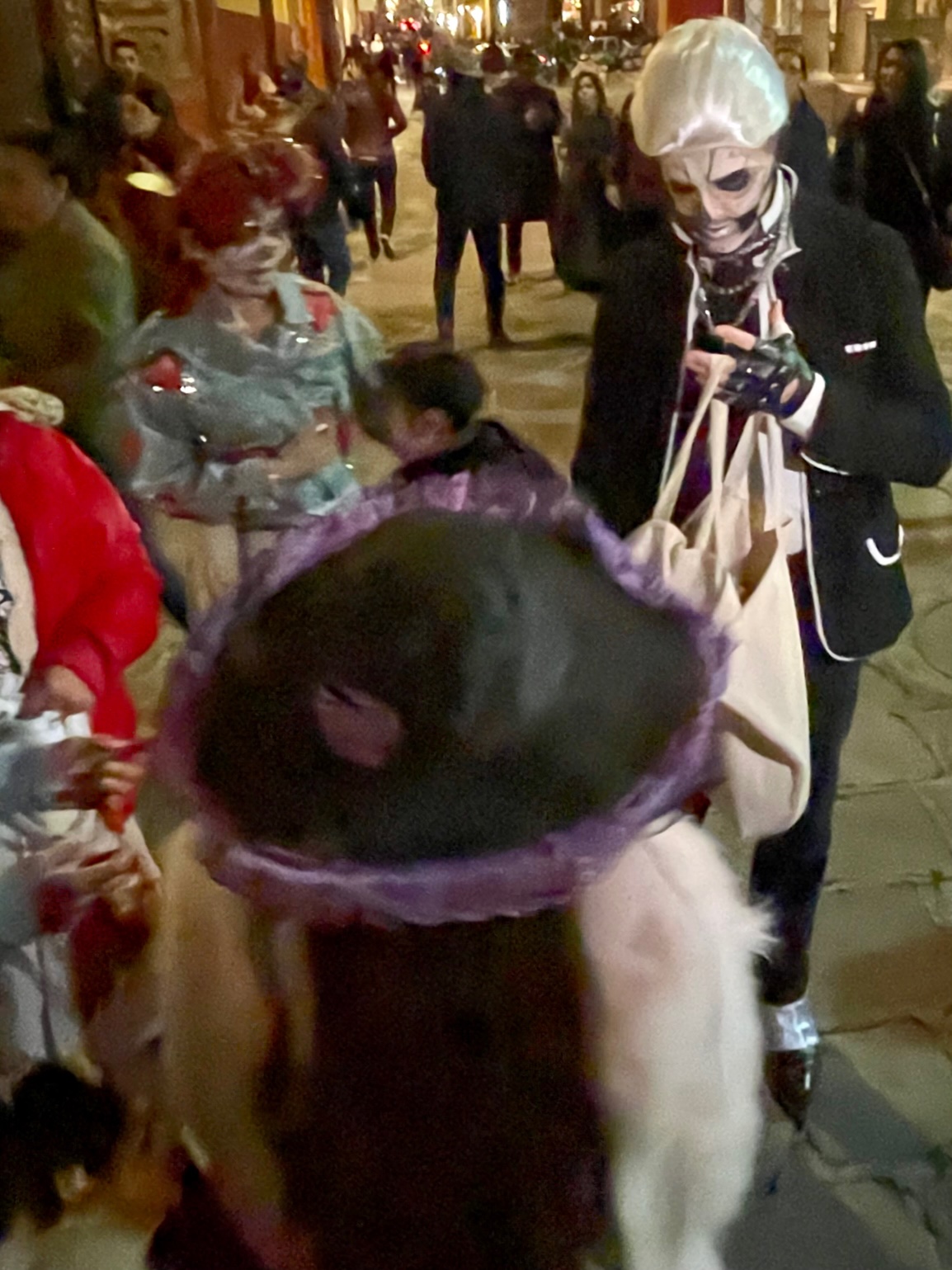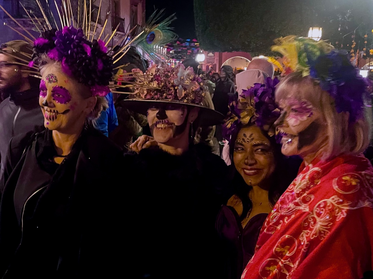 Gaily costumed and made-up men and women just sort of filtered into the plaza last night in twos and fours. If there was a grand parade from any of the private Catrina parties around San Miguel de Allende, it was after I left.