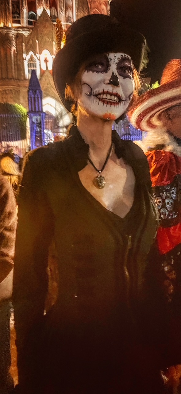There were lots of traditional Catrinas and Catrines but there were spinoffs, too. Like the two cowboys, the bishop, the woman in the illuminated cape, and the tyrannosaurus rex. Yes, a dinosaur. It is just that kind of year.