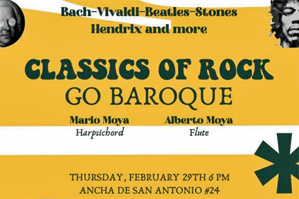Going for baroque on rock ‘n’ roll:  Mario Moya on harpsichord and Alberto Moya on flute will interpret the likes of the Beatles, Rolling Stones, and Jimi Hendrix through a unique blend of classic rock and baroque music. They will throw in some Vivaldi and Bach for free!