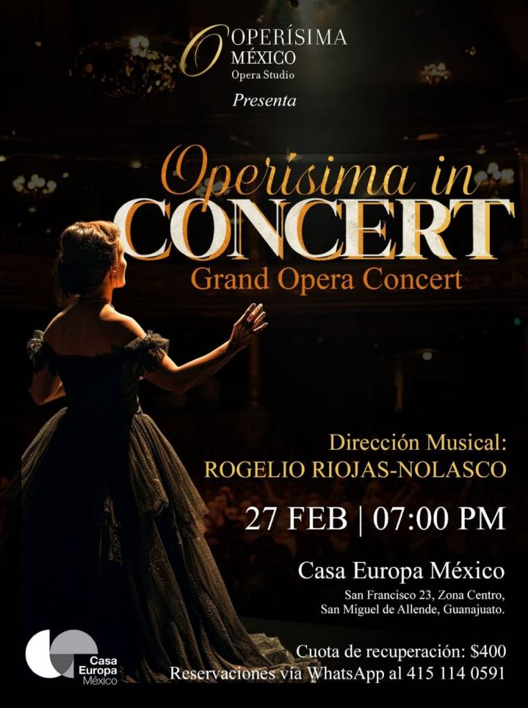 Operisima in Concert: A night of set pieces, arias, and vocal showcases, presented by at least 10 talented young people of Operisima Mexico, under the direction of maestro Rogelio Riojas. Operisima now has a home base in Los Frailes at Casa Puccini where their stated goal is to perform a whole opera each month. Casa Europa in Centro is a sort of home away from home for showcases.