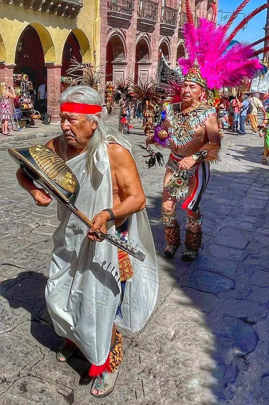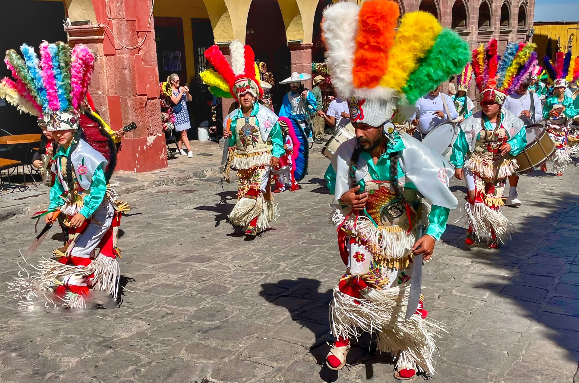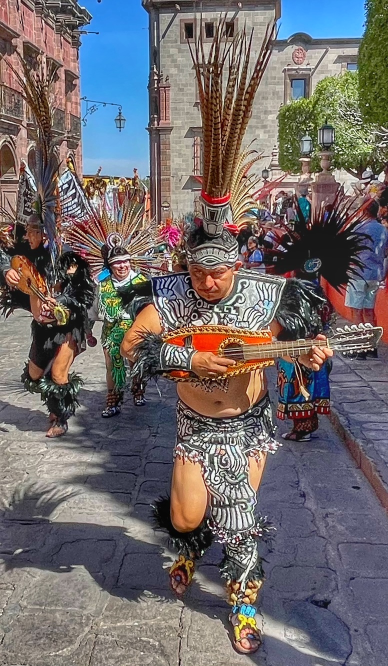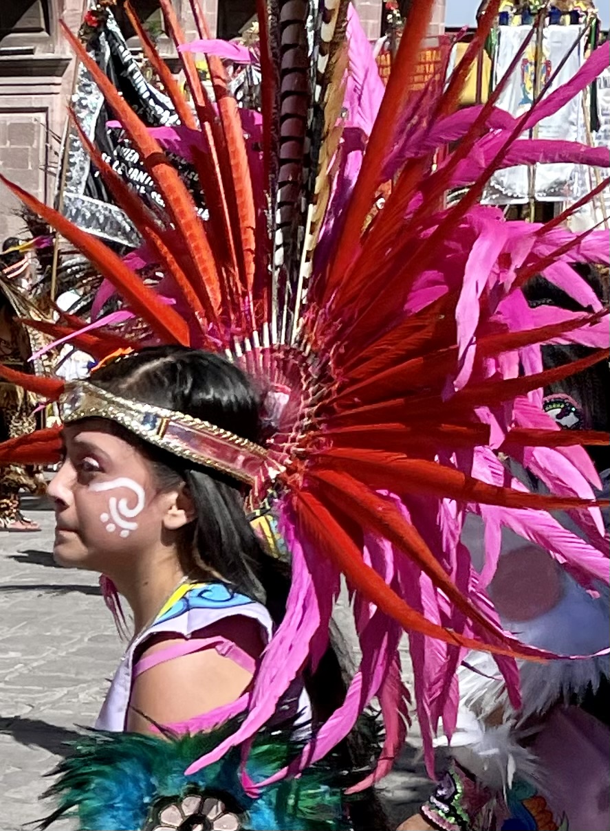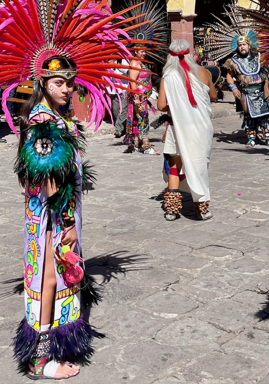All day today, since sunrise roughly, colorfully costumed dancers, drummers, and musicians have been filing into the central jardin of San Miguel de Allende. They fill the four corners of the park in front of the Parroquia de San Miguel Arcangel with trancelike dances to the steady beat dozens of drums.