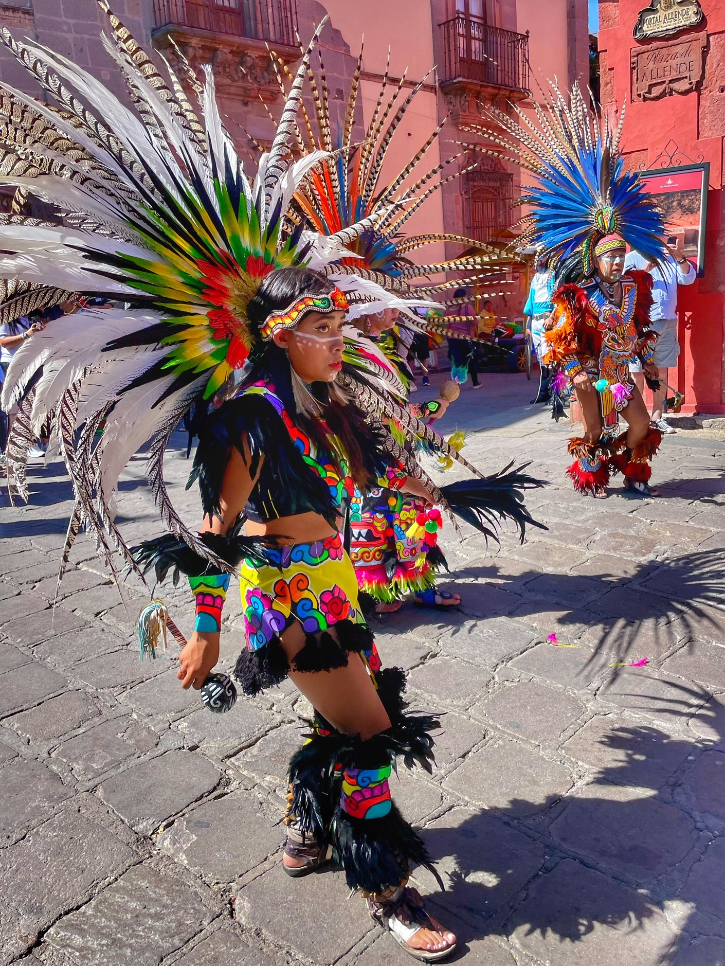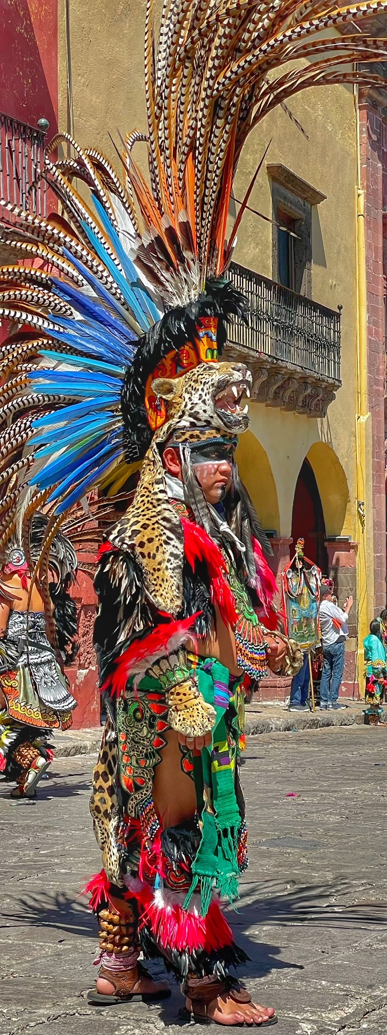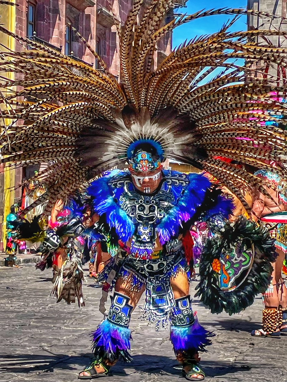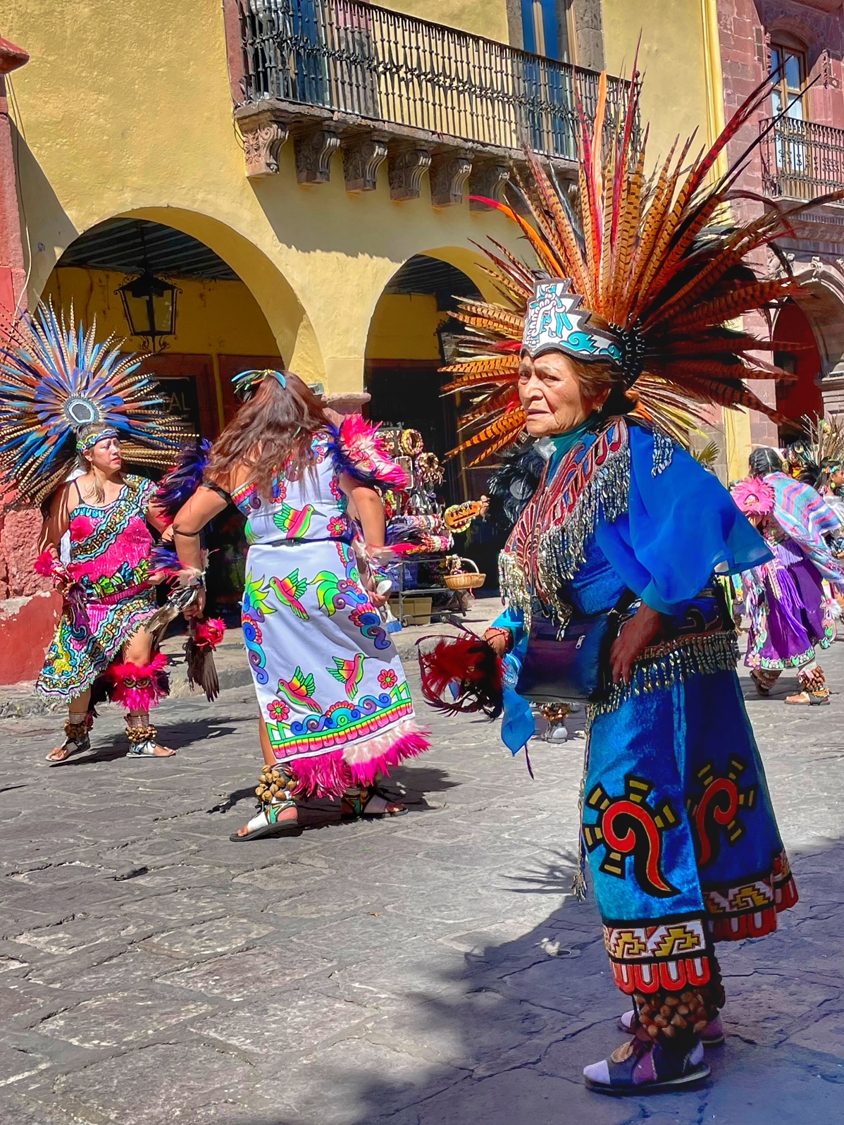 All day today, since sunrise roughly, colorfully costumed dancers, drummers, and musicians have been filing into the central jardin of San Miguel de Allende. They fill the four corners of the park in front of the Parroquia de San Miguel Arcangel with trancelike dances to the steady beat dozens of drums.