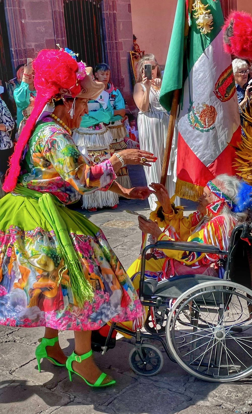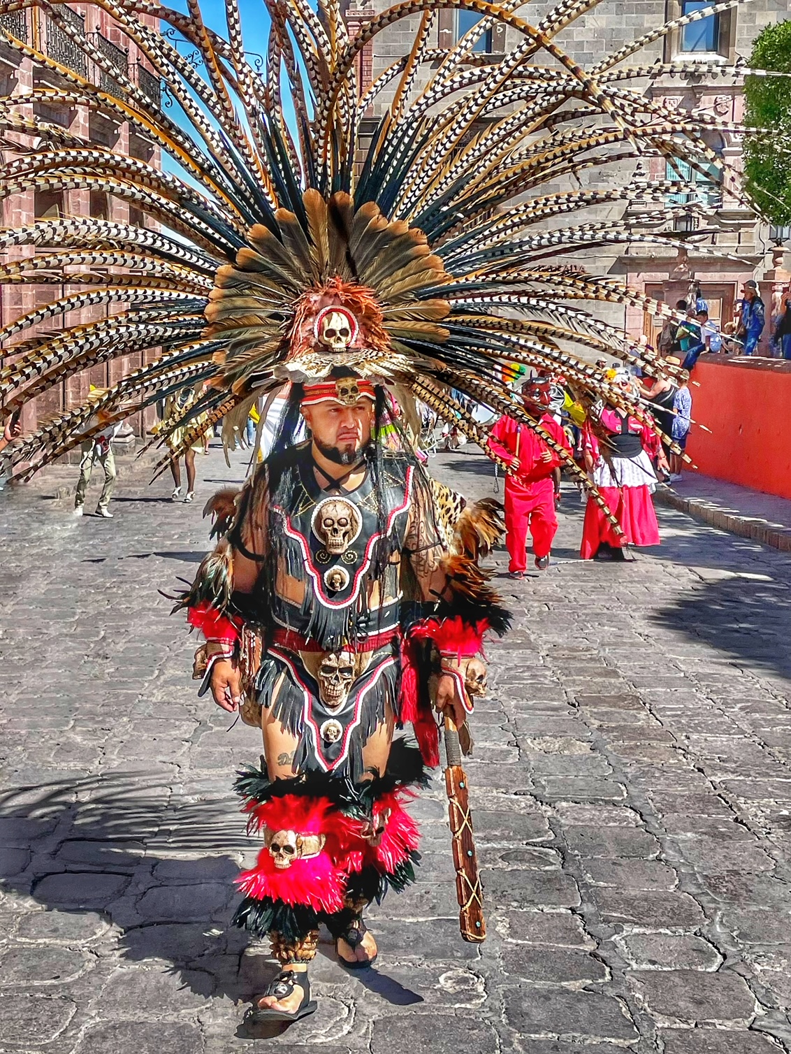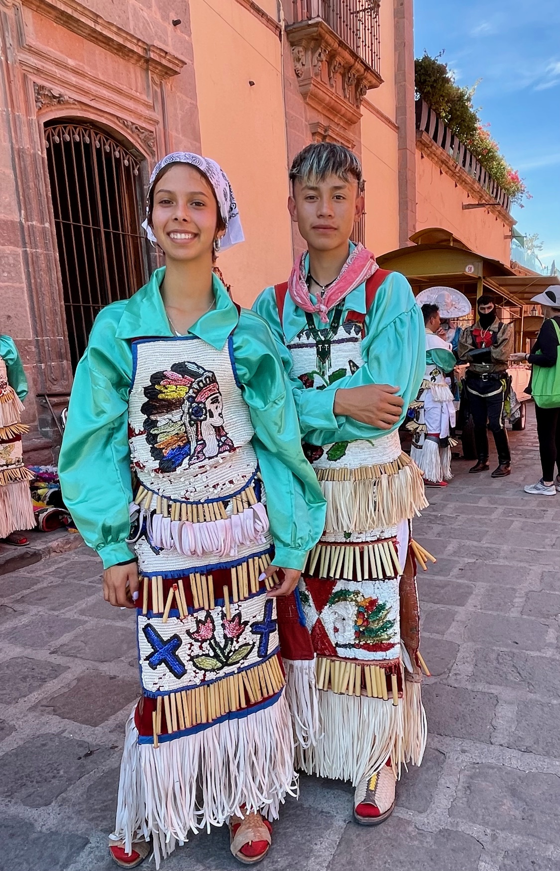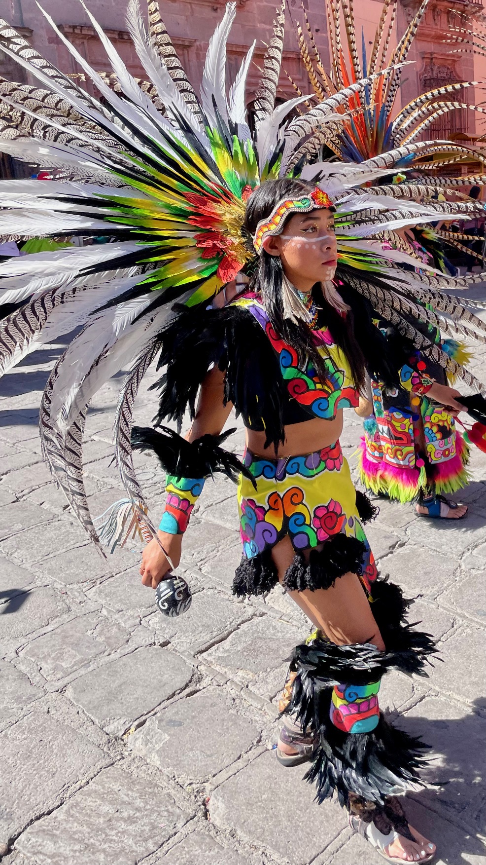 All day today, since sunrise roughly, colorfully costumed dancers, drummers, and musicians have been filing into the central jardin of San Miguel de Allende. They fill the four corners of the park in front of the Parroquia de San Miguel Arcangel with trancelike dances to the steady beat dozens of drums.