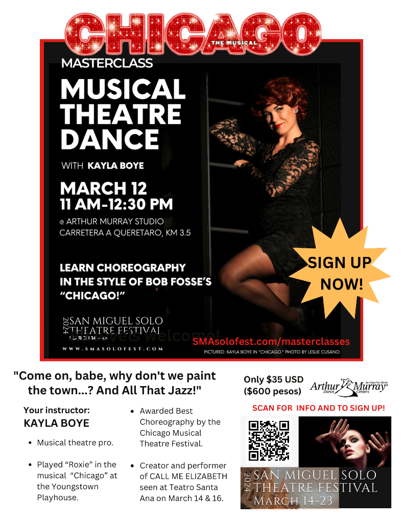 Dancer-choreographer-actor Kayla Boye is teaching some cool moves from the Broadway hit musical “Chicago” in a one-day-only Master Class at the Arthur Murray Dance Studio. Boye is in town to perform her solo play “Call Me Elizabeth” as part of the inaugural SMA Solo Theatre Fest.