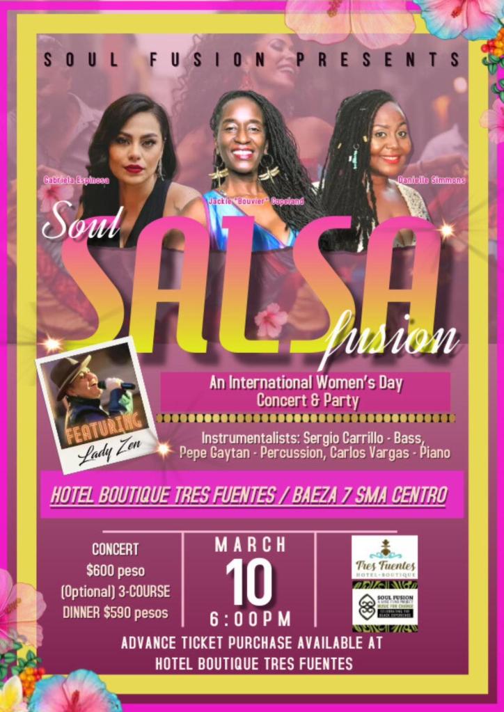 Four powerful voices will sing out in honor of International Women’s Day in a Soul Fusion Salsa concert at Tres Fuentes Hotel, Calle Baeza #7, Centro.