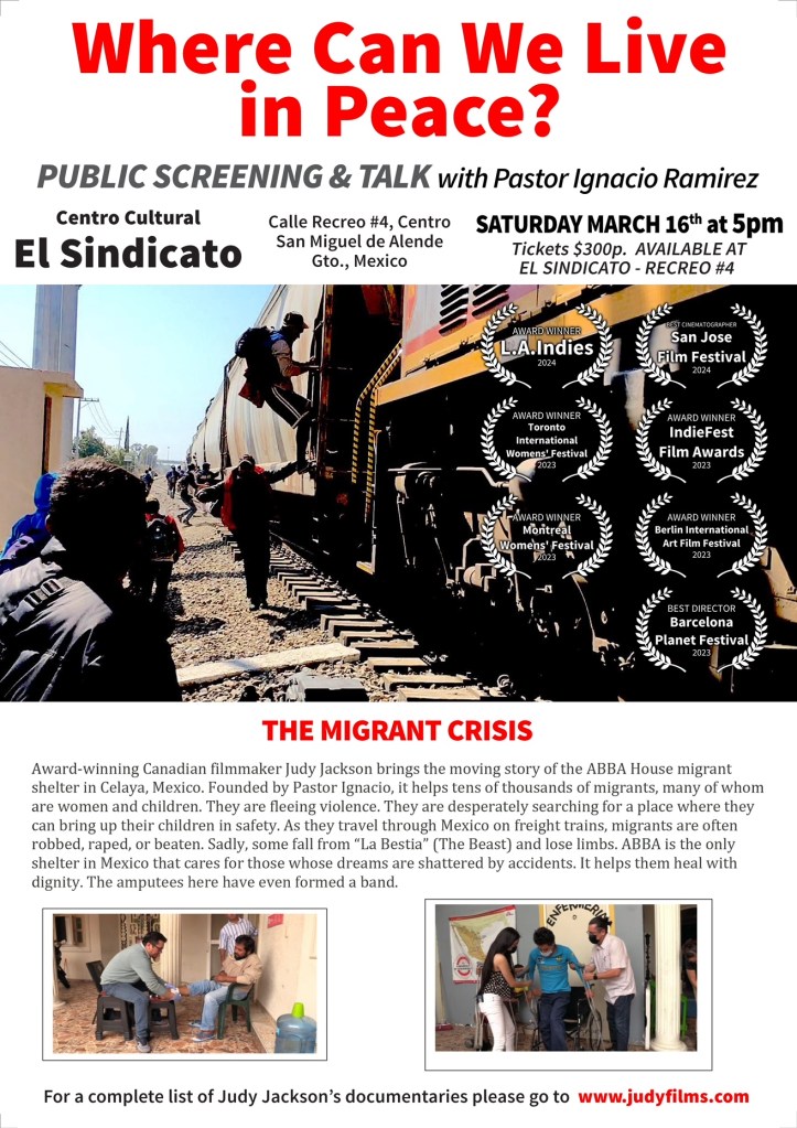 The ABBA House migrant shelter documentary “Where Can We Live In Peace?” will get an important screening at El Sindcato Cultural Center on Saturday at 5 p.m. There will be a Q&A afterward with filmmaker Judy Jackson and Pastor Ignacio Martinez Ramirez, who heads ABBA House in Celaya. A $300 mxn donation will be asked. Tickets can be obtained at Sindicato.