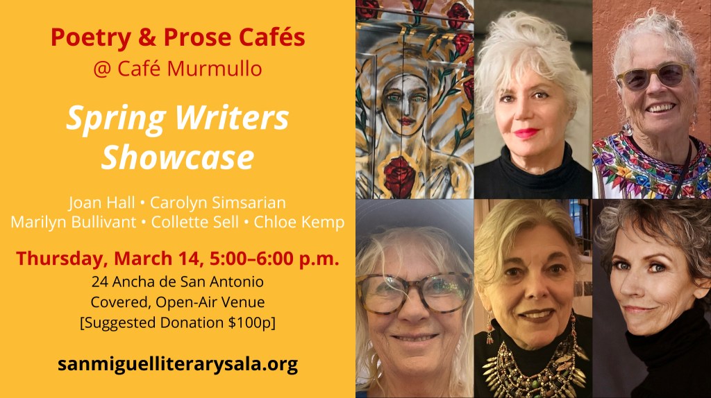 Five writers will expound on life’s journeys in San Miguel de Allende and beyond at the Poetry and Prose Café. The final event of the 2023/24 season features Carolyn Simsarian, Chloe Kemp, Joan Hall, Collette Sell, and Marilyn Bullivant.