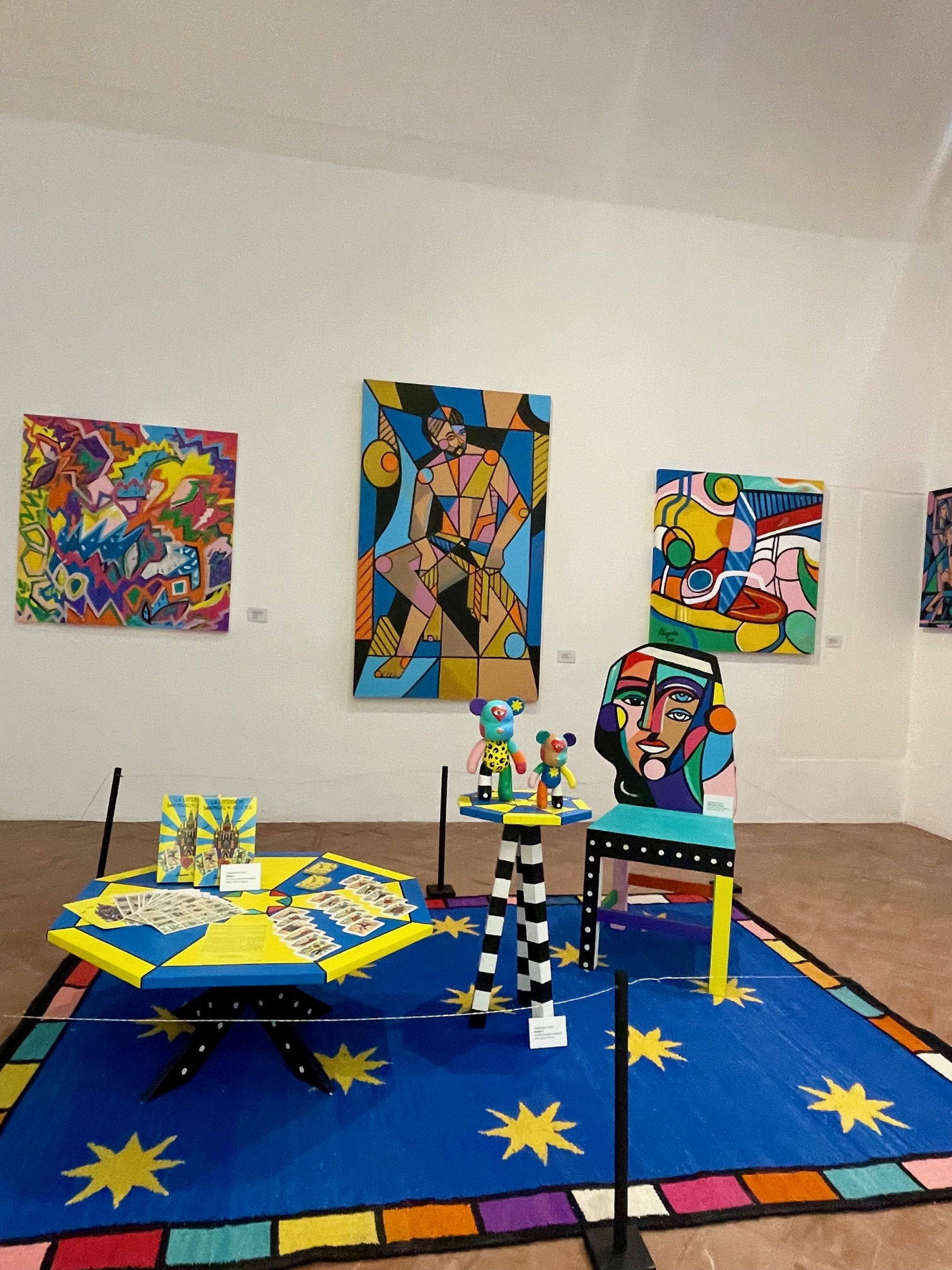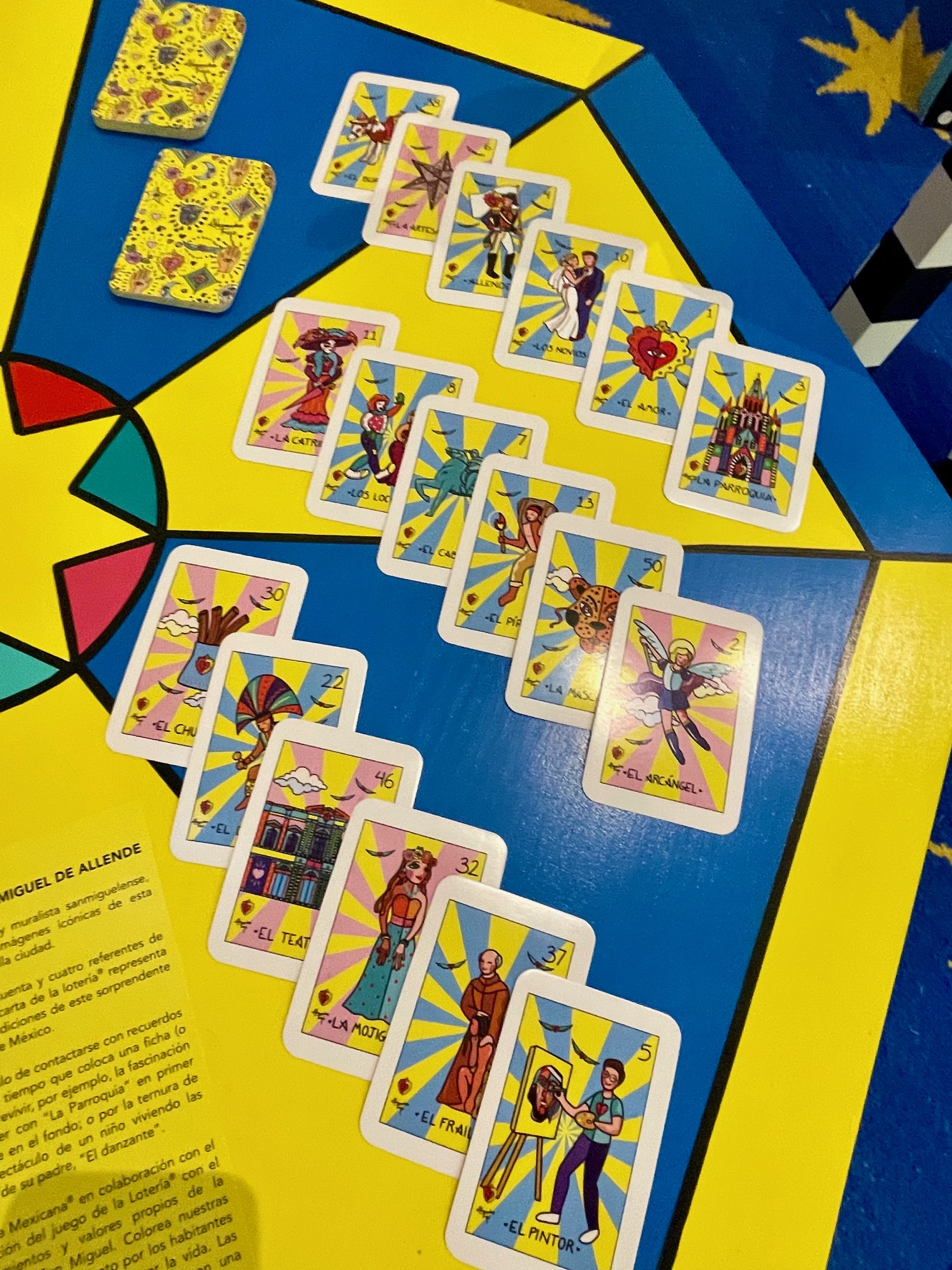 Other parts of the exhibit include the card set La Loteria de San Miguel de Allende, colorful furniture and dolls, and some brilliant paintings. Trejo’s vision of San Miguel is vibrant, abstract, and fairly humming with a cheerfully disorienting pop perspective of life in this community.