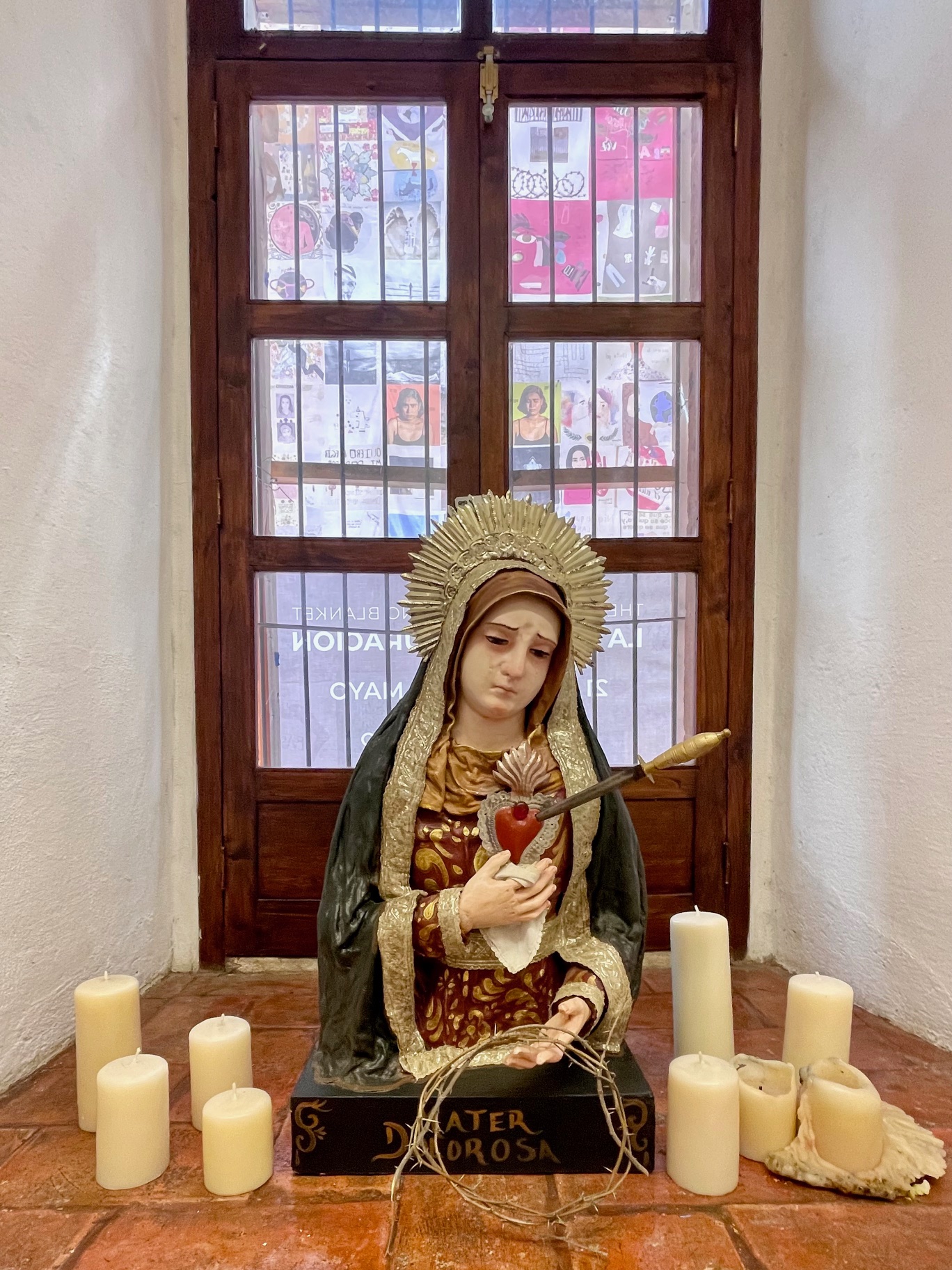The iconic depictions of the sorrowful God, Mary, and Jesus echo the centuries past but were created in recent years. As if to say, time has no meaning where pain is ever-present. One statue of Mary, surrounded by votive candles and set on a deep window sill, Mater Dolorosa, depicts a dagger piercing her heart.