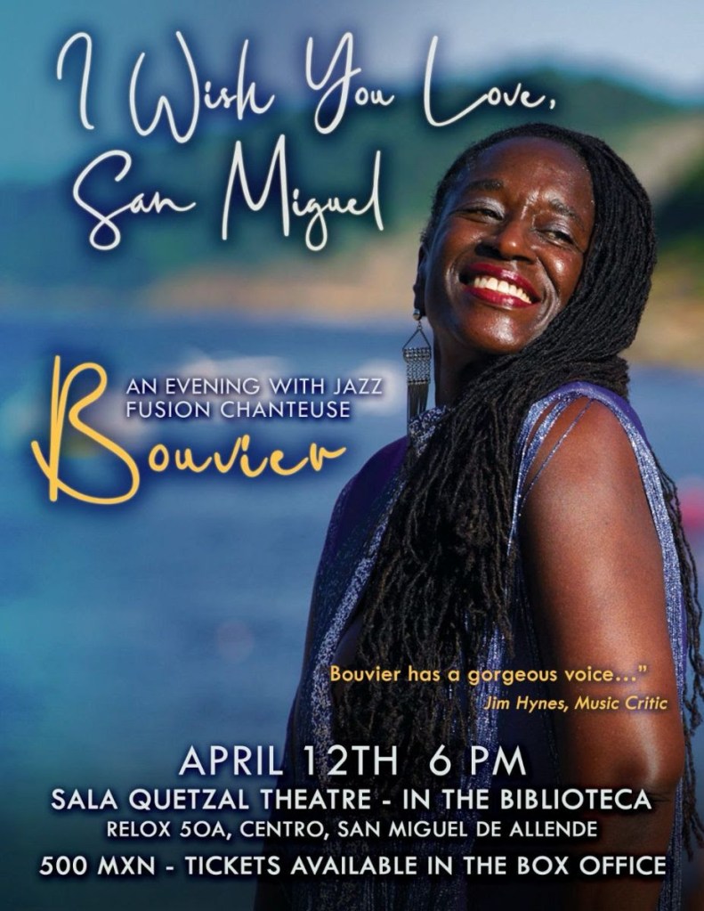 “I Wish You Love, San Miguel” will be “a love song to this beautiful city and a musical conversation about love’s complex dimensions,” according to Bouvier. Her eclectic tastes show up in a fusion of spirituals, blues, jazz, R&B, soul, salsa, reggae, and more in English, and with some Spanish.
