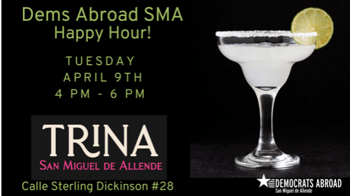 The local chapter of Democrats Abroad invites you to Happy Hour at Trina Cantina, Stirling #28 in Colonia San Antonio. “Hang out with fellow Dems & enjoy some munchies with great drinks,’ say your hosts. “Come enjoy the company of wonderful, like-minded people!”