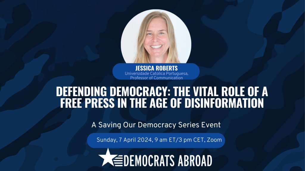 This one is near and dear to my heart. Democrats Abroad is offering the chance to join the respected journalism professor and author Jessica Roberts in a live, online discussion, titled “The Vital Role of a Free Press in the Age of Disinformation.”