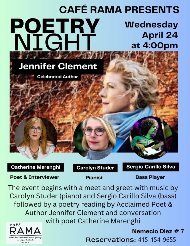 Author Jennifer Clement will read at Cafe Rama’s Poetry Night. A Meet and Greet with music provided by pianist Carolyn Studer and bassist Sergio Carrillo Silva precedes the reading. Afterward, poet and memoirist Catherine Marenghi will interview Clement and take questions from the audience.