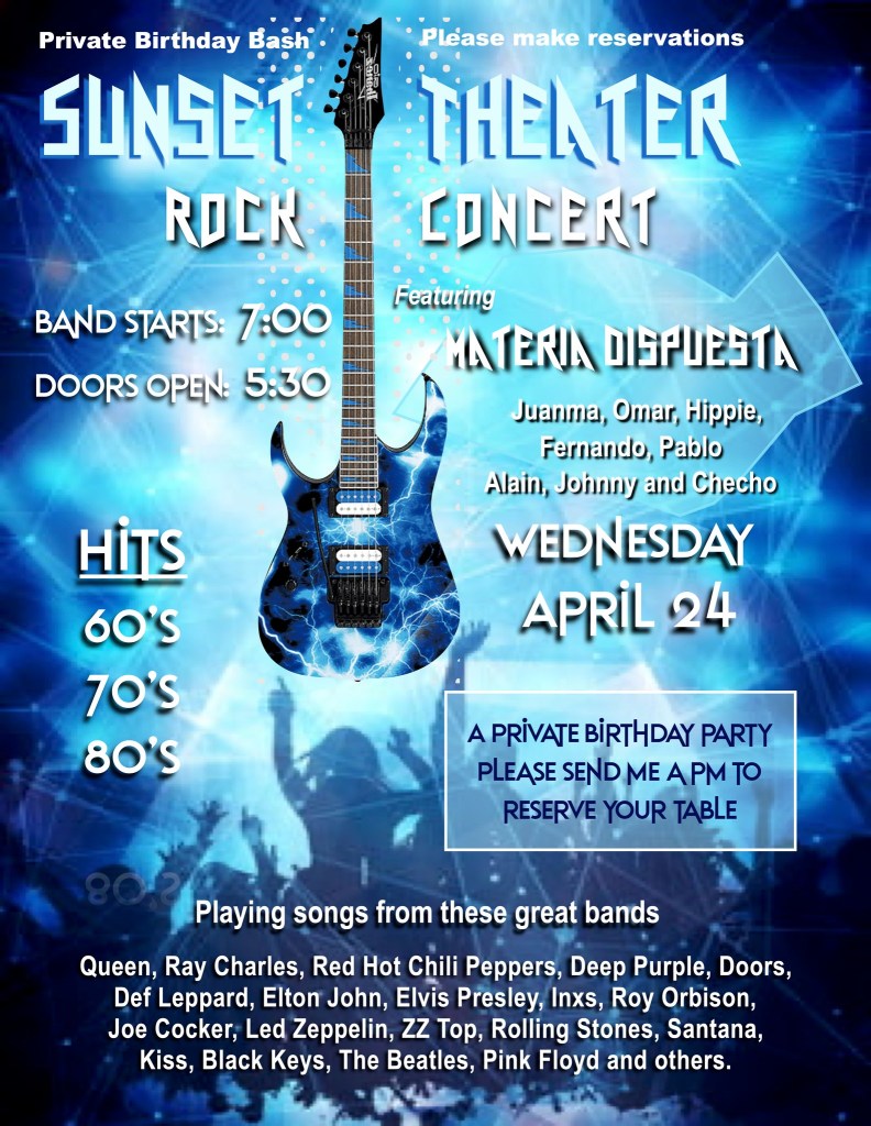 The concert will feature music of the 60s, 70s, and 80s by the band Materia Dispuesta. Doors open at 5:30 p.m. and the band rocks at 7 p.m. Nothing is sold on the premises so bring your own picnic dinner and beverages.
