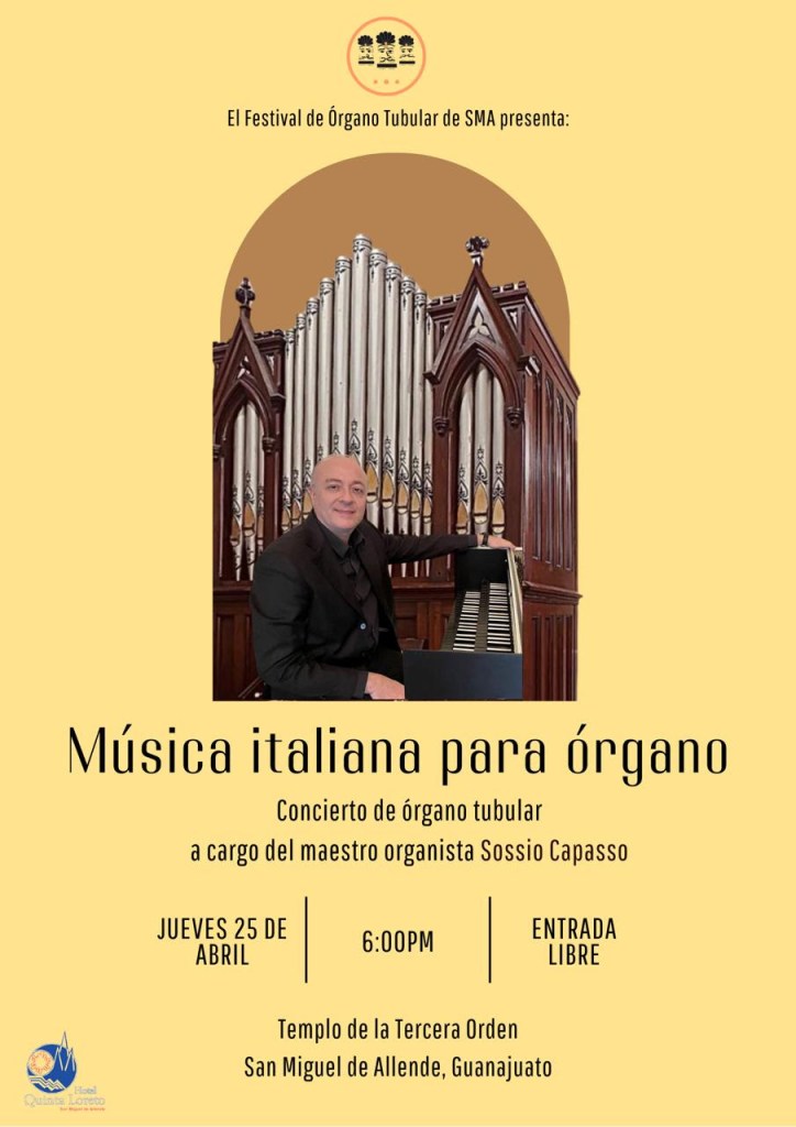 The San Miguel Organ Festival, in conjunction with Chorale San Miguel, is bringing Italian organist Sossio Capasso to the Templo de la Tercera Orden on Calle San Francisco to perform an all-Italian music concert on the 1875 pipe organ. Chorale San Miguel under the leadership of Malcolm Halliday, purchased and restored the Johnson & Son organ. It was reassembled in the temple in late-2023 and has been featured in numerous concerts. Doors open at 5:15 p.m.