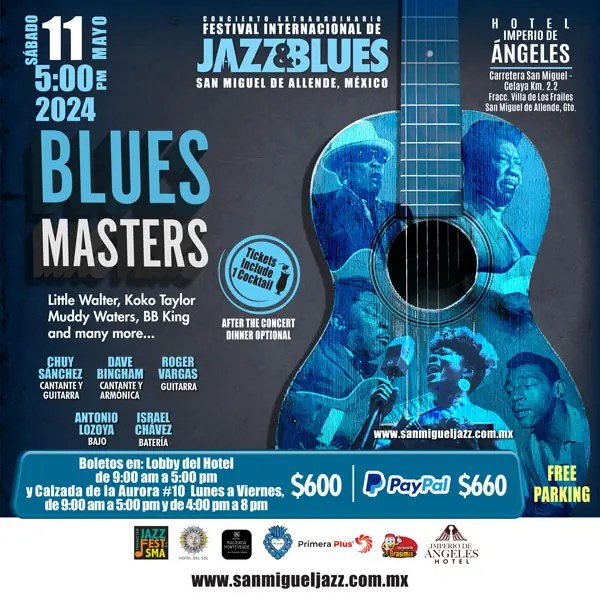 Some Koko Taylor, Muddy Waters, Little Walter, BB King, and more are on the menu when the San Miguel Jazz and Blues Festival turns its talents toward the Masters of the Blues. Chuy Sanchez (vocals and guitar), Dave Bingham (vocals and harmonica), Roger Vargas (guitar), Israel Chavez (drums), and Antonio Lozoya (bass) provide the stellar lineup.