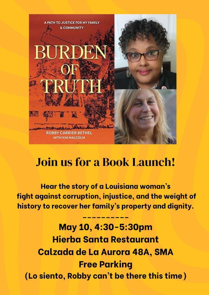 Kim Malcolm has launched quite a few books since opening Aurora Books in Guadalupe. This one has her name attached to it. The author is Robby Carrier Bethel and “Burden of Truth” tells how a major oil company with the support of the town’s white elite stole the Louisiana land of her ancestors and how she battled for justice.