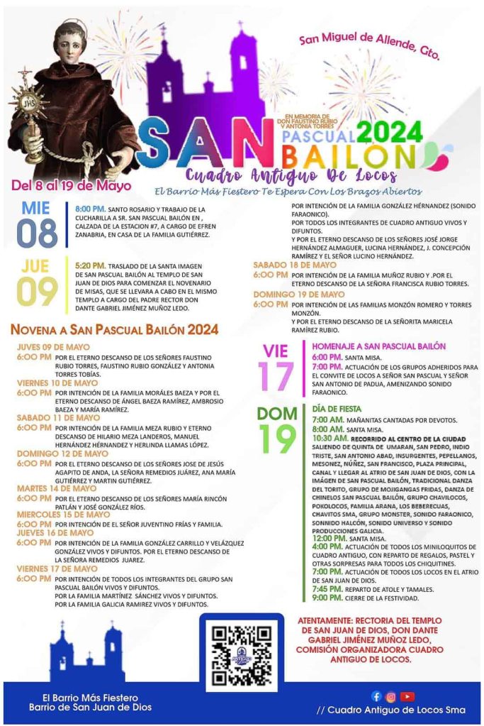 Pascual is the patron saint of the Crazies/Locos the wonderful dancers who get up in amazing costumes and dance with boundless energies through the streets of San Miguel. This is just the beginning. May 19 is the date to mark down. Lots going on and we’ve added the poster of events at the bottom of this blog post.