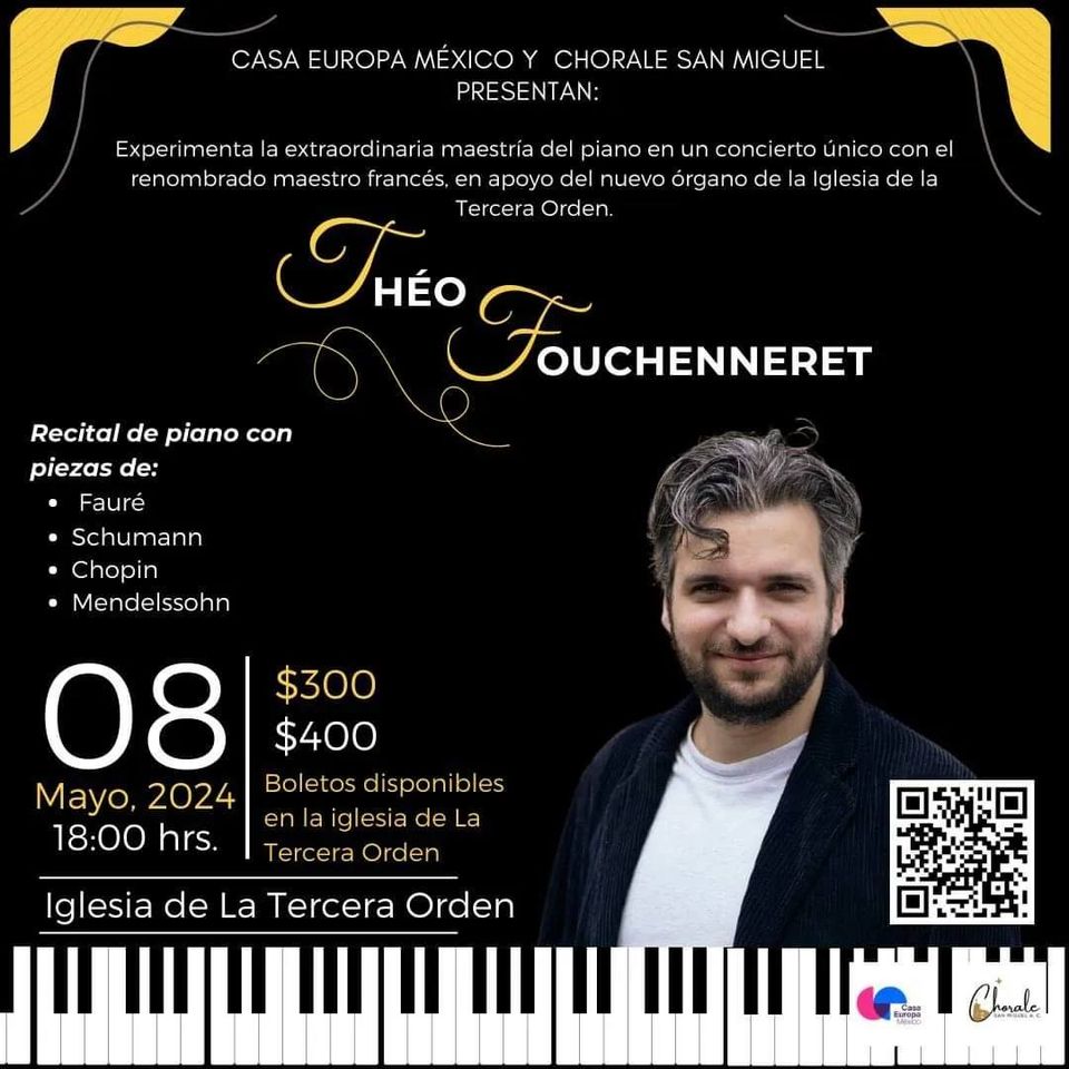 Extraordinary international pianist Théo Fouchenneret will perform at the Church of the Third Order, Calle San Francisco, Centro. Normally the church is the home of the San Miguel Chorale. The Casa Europa-sponsored concert is expecting an audience larger than its own facilities can accommodate.