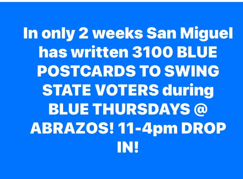 Abrazos owner Patrice Wynne says stop in any time on Thursdays, sit down and write a few cards, or take some home if you’re — like me — the shy but democratically motivated type. That’s EVERY Thursday until the election!