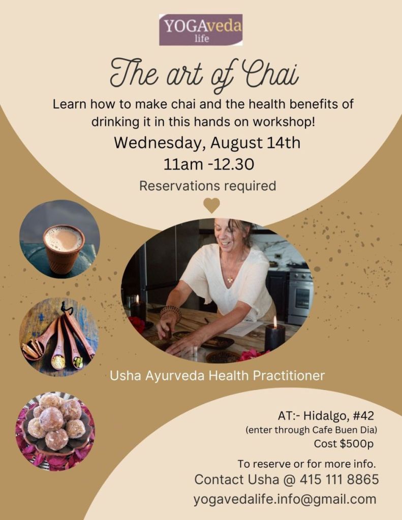 Chai means “tea” in India but is so much more than that. Chai varies around the world but usually includes black tea mixed with spices, like cinnamon, cardamom, cloves, ginger, and black peppercorns. Cafe Buen Dia at Hidalgo #42 is offering a workshop on chai where you can learn The six tastes according to Ayurveda, the health benefits of chai, which spices are best to use, and how to make your very own blend of chai.