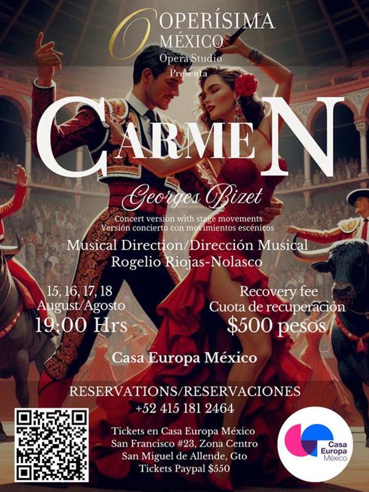 “… that none can tame.” Powerful lyrics from the sultry and sensuous aria popularly called “Habanera” in French composer Georges Bizet’s 1875 opera “Carmen.” You’ll be able to hear it and so much more when Operísima México performs the opera comique Aug. 15-18 at Casa Europa México, Calle San Francisco #23, Zona Centro.