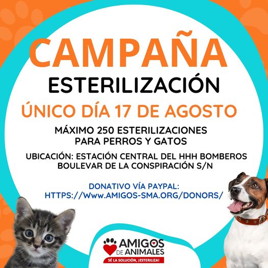 “If you have your pet, #dog or #cat, and you want it not to have furry blessings take advantage of the campaign that will be on Saturday, August 17, at the #firehouse on the Blvd. de la Conspiracion at the Cuerpo de Bomberos. The tokens will start to be distributed on the same day of the campaign from 7 a.m. We don’t make appointments. Only one pet per person will be accepted.