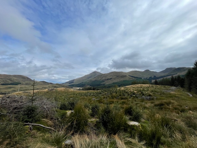 Eventually, the path takes you under the train tracks and highway which run parallel through the glen and curves upward across the face of several hills, widening the vistas before a steep descent to Crainlarich and its train station: