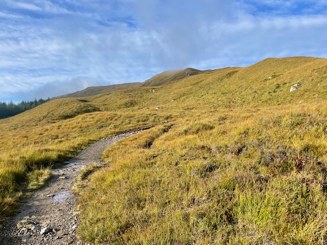 After crossing the arched stone Bridge of Orchy, the trail moves quickly upward through a lightly forested patch. (Every day seems to start with a steep-pitched climb, but that could just be my imagination.)