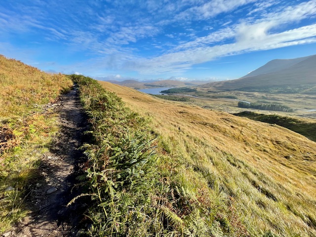 This is familiar territory, climbing the path cut into a hillside, with a sweeping glen below that opens up to Lock Tulla, a constant companion for several miles, The Loch reveals more and more of its sizeable body with each rise and turn. As lakes go, it’s a beauty.