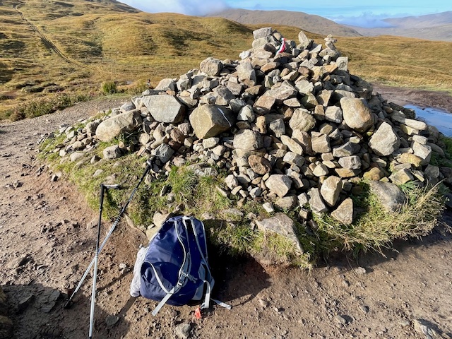 I find my cairn atop a rise just off the path and leave my Tri-Color ribbon atop the pile. I want to hang around a bit and contemplate the beauty of the view and the warming temperament of the day but: midges.
