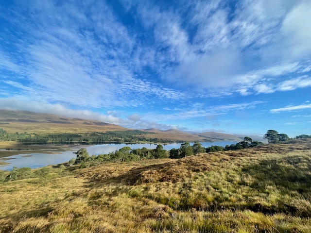 There is an autumn chill in the air this morning but you know what there isn’t? A lot of clouds. This is a good thing because I’ve been carrying an unused pair of sunglasses in my backpack for weeks. I’ve also been wearing shorts since Day 2 in anticipation of warm weather. Justified, at last! But the big reason is that Rannock Moor is wide open country and can turn hellish in blustery rainy weather. Which is the National Weather of Scotland.