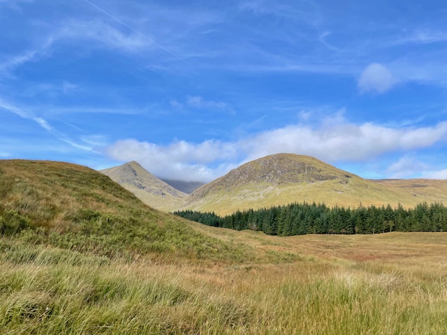 In Scotland, there are beinns and munros (hills and mountains). Hills are most anything below 3,000 feet and that is what we’ve been mostly skirting on the West Highland Way. They are impressive as you walk trails carved into their lower regions. They form majestic, sloping walls on either side of gentle glens.